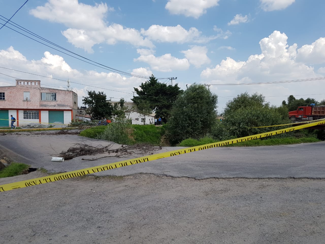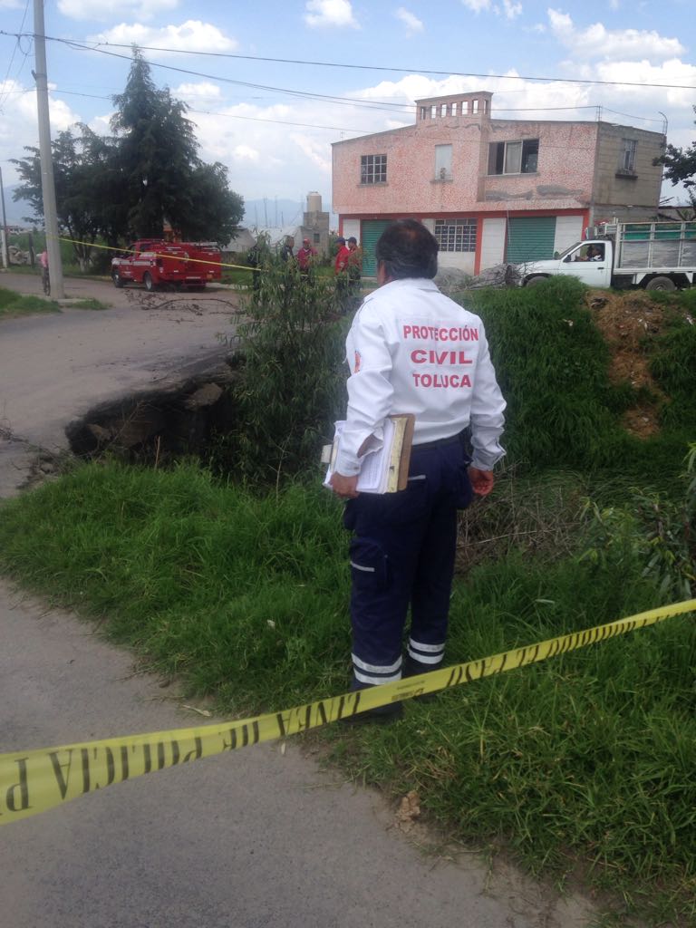 Toluca, Estado de México.- Elementos de la Policía municipal de Toluca y de Protección Civil, acordonaron un puente vehicular en la comunidad de San Diego Linares debido a que presenta fallas estructurales en su base, la medida preventiva se mantendrá hasta su reparación.