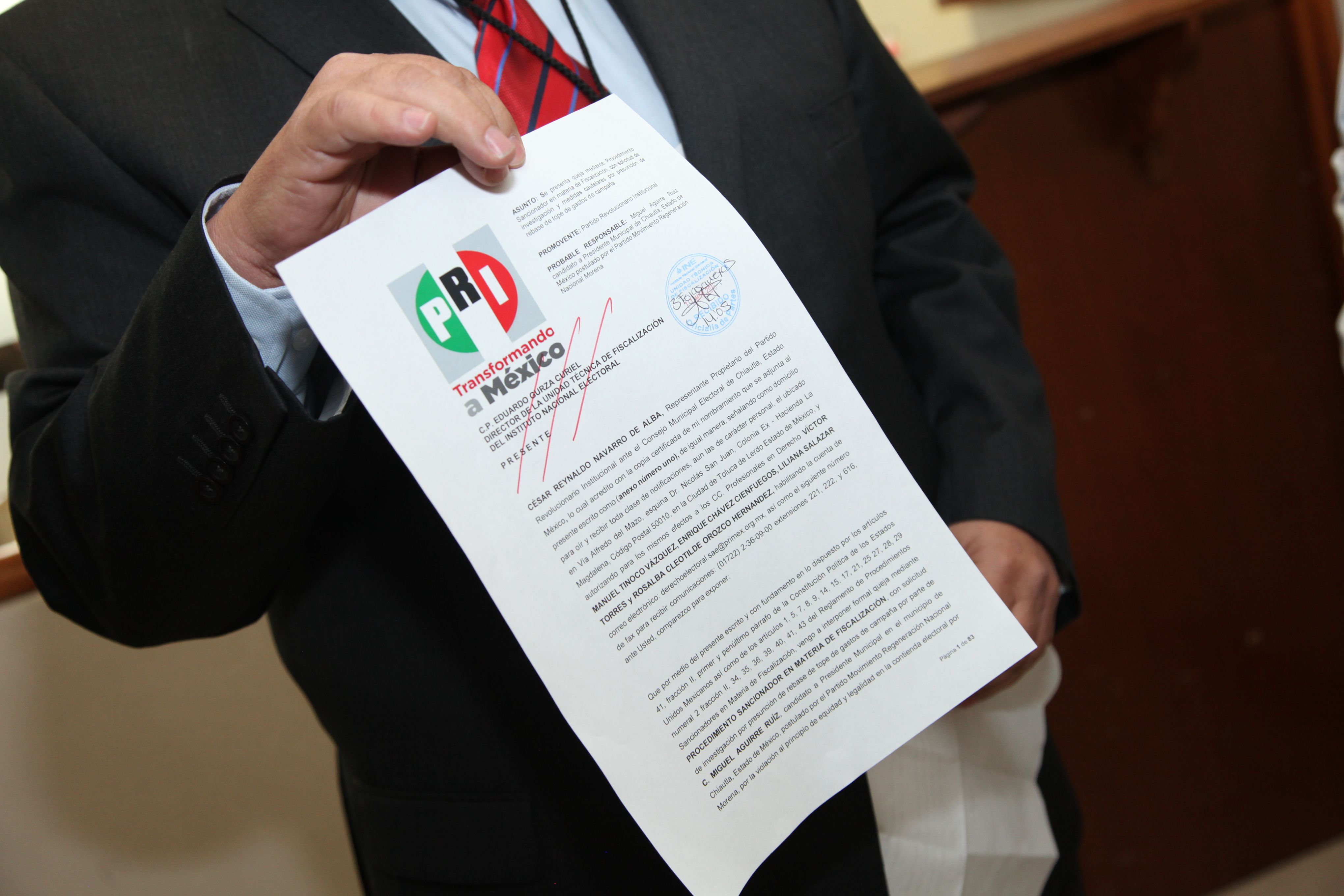 El Partido Revolucionario Institucional del Estado de México presentó una queja ante la Unidad Técnica de Fiscalización del Instituto Nacional Electoral (INE) para que se investigue el presunto rebase del tope de gastos de campaña del candidato de MORENA a la presidencia municipal de Chiautla.Luego de acudir a las instalaciones del Instituto Nacional Electoral para presentar el documento en el que se pide investigar dicha acción que violentaría la Ley, el representante ante el Consejo Municipal Electoral del IEEM en Chiautla, el diputado César Reynaldo Navarro, aseveró que existen diversos actos en los que se sustenta esta acusación como son el excesivo número de bardas, espectaculares, vinilonas, pendones, inserciones pagadas en medios de comunicación, así como el uso de vehículos de lujo para el perifoneo a favor del candidato de MORENA a la presidencia municipal de dicha demarcación que este domingo tendrá elecciones extraordinarias.