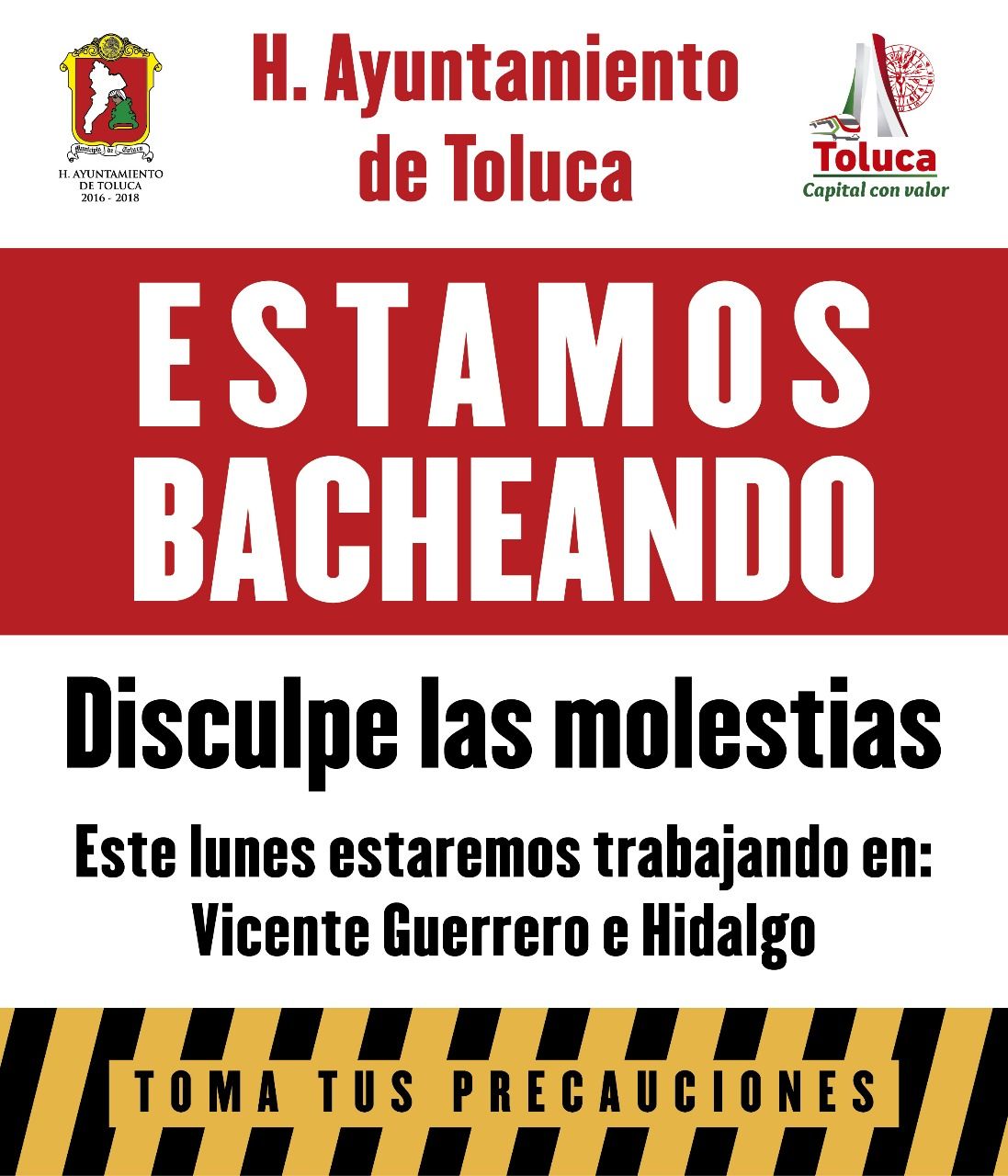 El bacheo en las principales vialidades del primer cuadro de la ciudad donde el flujo vehicular, la temporada de lluvias y el desgaste natural del pavimento han generado la aparición de más baches, se reforzará a partir de este lunes, por lo que la administración municipal solicita su comprensión a la población y la invita a consultar las redes sociales en facebook: Dirección de Obra Pública-Toluca, Municipio de Toluca y Comunicación Social Toluca, donde se publicarán las calles que se atenderán diariamente.