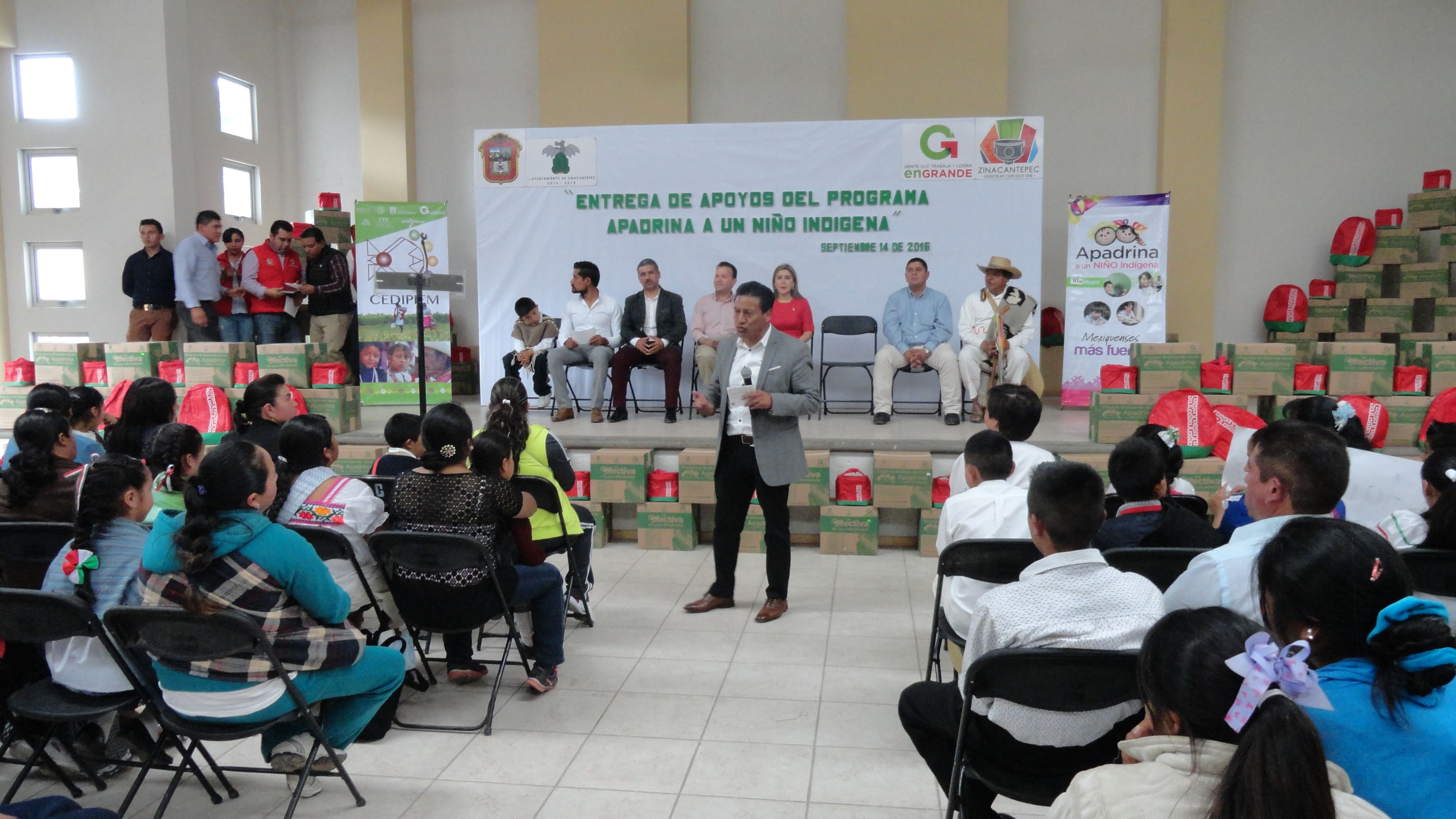 El presidente municipal de Zinacantepec, Manuel Castrejón Morales, acompañado por Abraham Monroy Esquivel, vocal ejecutivo del Consejo Estatal para el Desarrollo Integral de los Pueblos Indígenas del Estado de México (CEDIPIEM); integrantes del cabildo; Julio César Alvarado Cruz, director de Desarrollo Social y directores de área, entregó 710 apoyos del Programa “Apadrina a un Niño Indígena” a 330 beneficiarios, consistentes en canastas alimentarias, mochilas, útiles escolares y monederos electrónicos.En el evento, el alcalde agradeció al presidente de la República Enrique Peña Nieto y al gobernador del Estado de México, Eruviel Ávila Villegas, “Dos grandes mexiquenses comprometidos, que trabajan a favor de los mexicanos y principalmente por los niños. Este programa dirigido a la niñez les ayuda a tener una alimentación más adecuada y a continuar sus estudios, porque en los niños tenemos la esperanza de un municipio, un estado y un país mejor” concluyó.