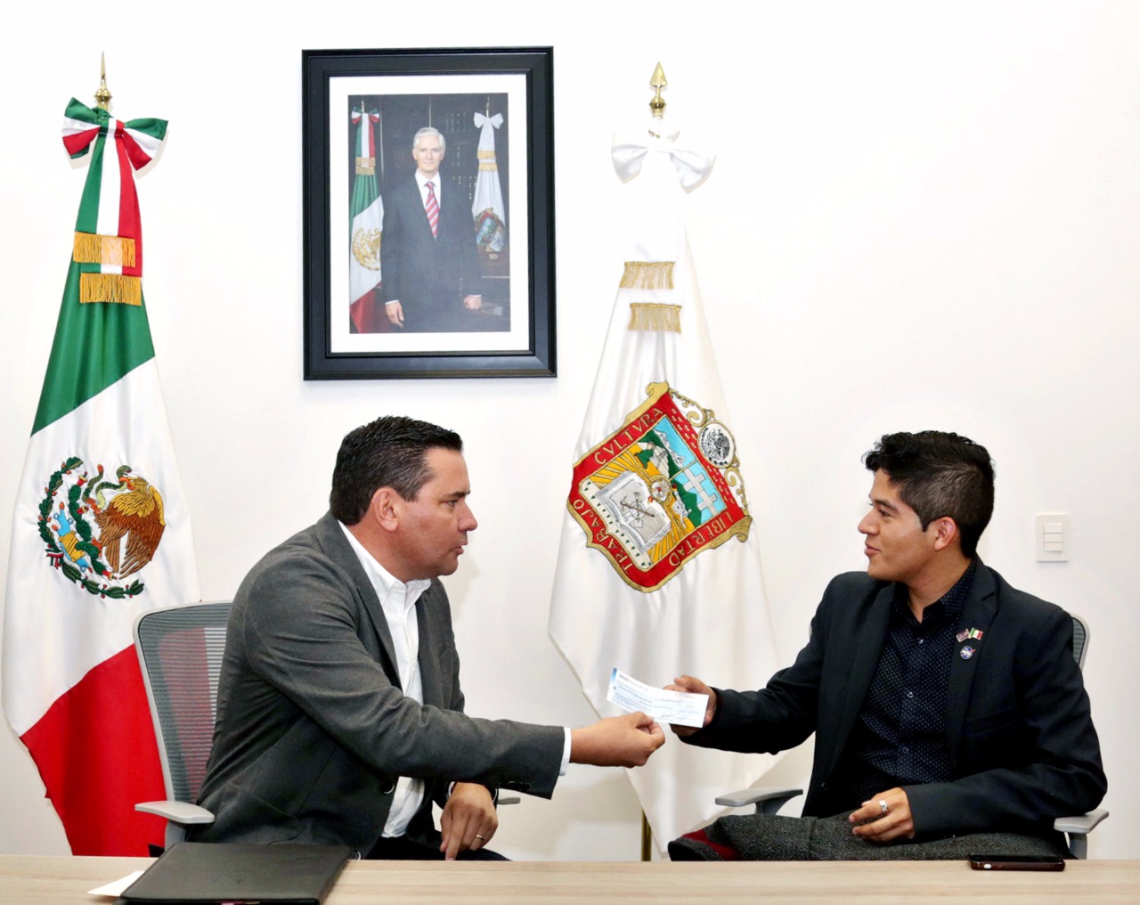 Toluca, Estado de México.- En representación del Gobernador Alfredo Del Mazo Maza, el Secretario de Educación, Alejandro Fernández Campillo, entregó un estímulo económico a Jonathan Sánchez, para su estancia en Rusia del 20 de agosto al 21 de septiembre, donde aprenderá el idioma y cursará materias relacionadas con temas aeroespaciales como aerodinámica, mecánica y tecnología de micro satélites.