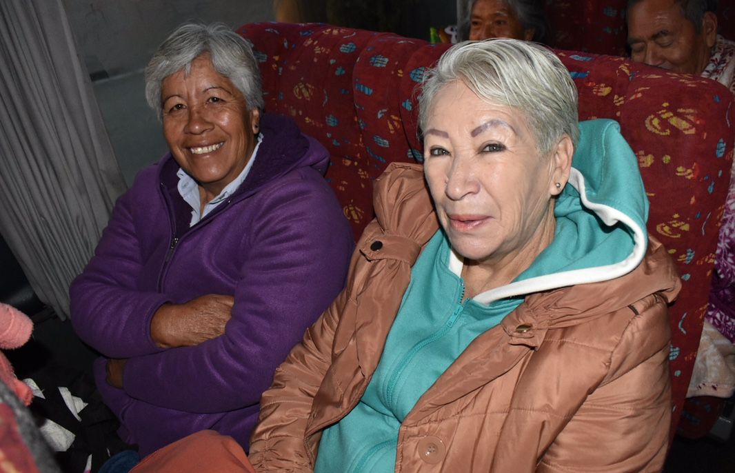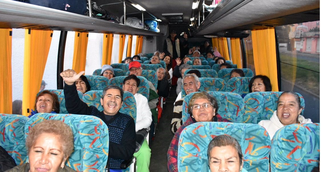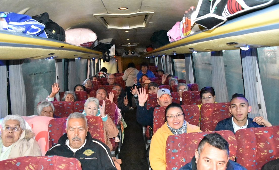 Los adultos mayores viajan en compañía de coordinadores municipales, doctores, enfermeros, paramédicos y personal de protección civil.