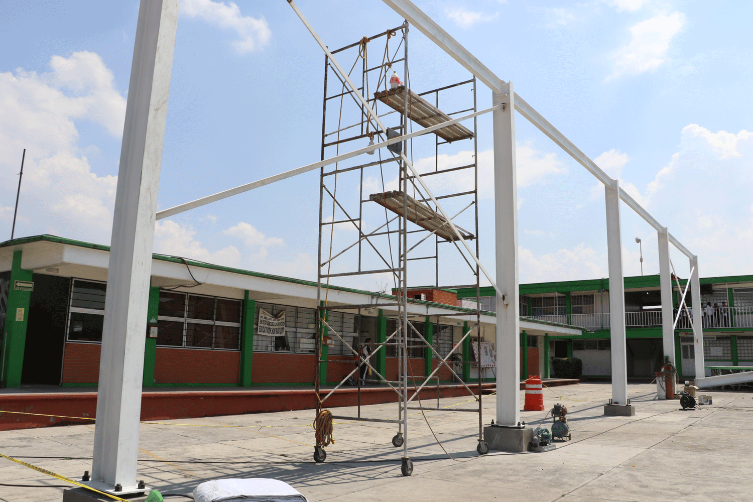 La construcción de la techumbre incluye la cimentación de zapatas aisladas, colocación de trabes, láminas y columnas, perfiles de acero y tubería para desaguar el agua pluvial, obra que cumple con la normatividad que dicta el Instituto Mexiquense de la Infraestructura Física Educativa.