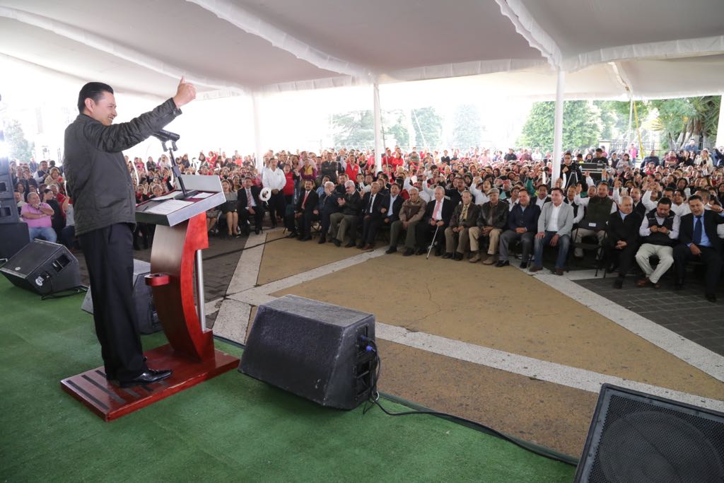 Acompañado por el Presidente Municipal, Jaime Cervantes Sánchez, el Diputado Federal por el Distrito 18, Miguel Ángel Ramírez Ponce, así como ex dirigentes del SMSEM, el Secretario General expresó su deseo de que la Unidad del magisterio influya en el tejido social para fortalecer la paz y prosperidad de la nación.