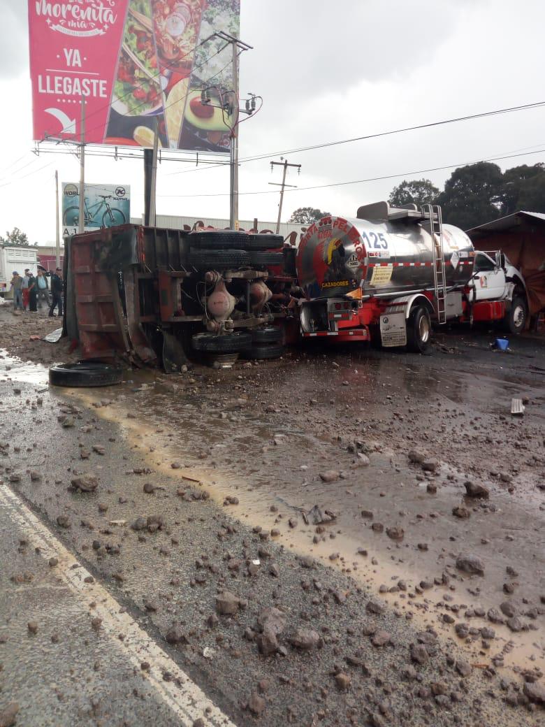 Derivado del percance, la pipa comenzó a incendiarse, mientras que el tráiler salió del camino hasta detenerse cerca de unos locales comerciales ubicados en la lateral de la carretera federal.