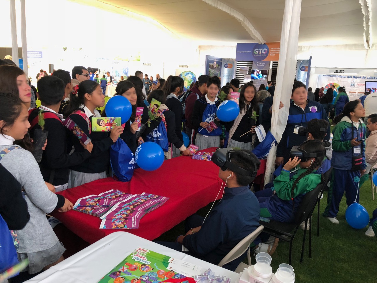 Querétaro, Querétaro, 24 de octubre de 2018. La Secretaría de Obra Pública del Gobierno del Estado de México participó en la IX Feria Interestatal de Cultura del Agua y Bosque 2018, que se llevó a cabo en el estado de Querétaro, donde niños de educación básica vivieron la experiencia virtual del recorrido del agua, desde su origen hasta su destino final en el drenaje, en el Domo hídrico y el Módulo de realidad virtual 360, de la Comisión del Agua del Estado de México (CAEM).