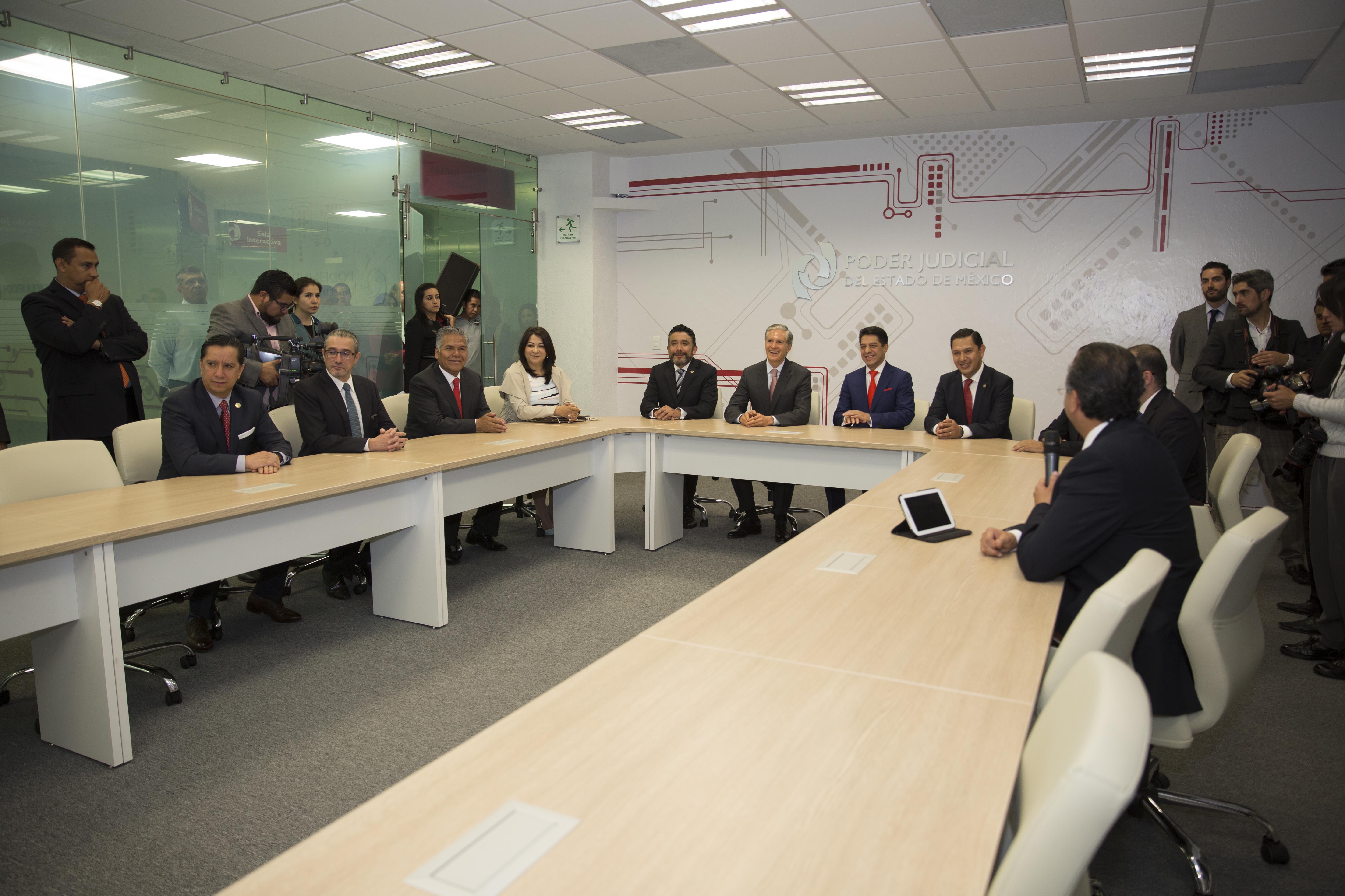 La aplicación de la tecnología en el ámbito de la administración e impartición de la justicia es un factor fundamental para el fortalecimiento de esta actividad en el Estado de México y es un paso más hacia la modernización de las instituciones, coincidieron el gobernador mexiquense, Alfredo del Mazo Maza y el presidente del Tribunal Superior de Justicia de la entidad, Sergio Javier Medina Peñaloza.Al inaugurar el Complejo de Telepresencia del Poder Judicial, Medina Peñaloza destacó que la entidad es pionera en la aplicación de estas estrategias al ser el único en el país, por lo que el Tribunal se coloca como referente global, al innovar el servicio público reduciendo el tiempo de procesos de cinco a seis meses en algunas audiencias.