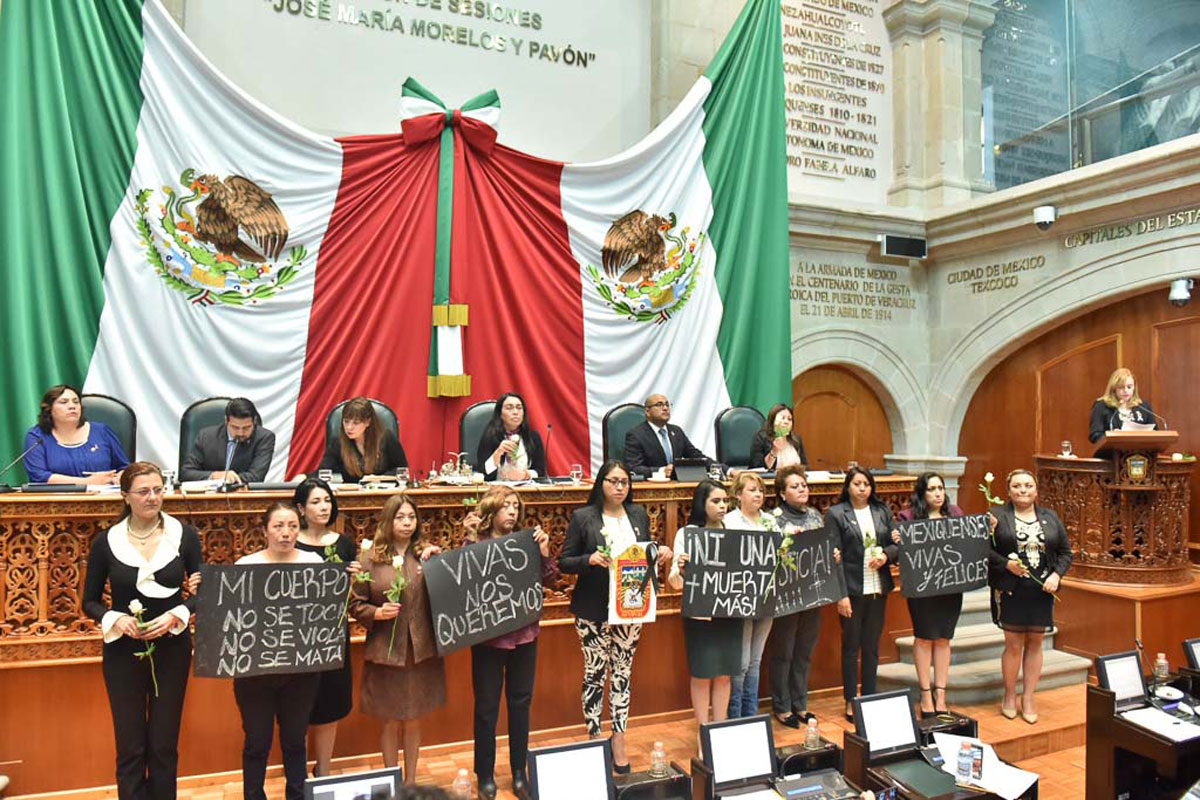 Mientras, desde la tribuna y en sus curules, sus compañeras diputadas Juliana Felipa Arias Calderón, del PES, Karina Labastida Sotelo, Mónica Angélica Álvarez Nemer, María de Jesús Galicia Ramos, Rosa María Zetina González, María del Rosario Elizalde Vázquez, Nancy Nápoles Pacheco, Montserrat Ruiz Páez, Claudia González Cerón, Xóchitl Flores Jiménez, Crista Amanda Spohn Gotzel, Liliana Gollas Trejo, Violeta Nova Gómez, Beatriz García Villegas, Elba Aldana Duarte, Alicia Mercado Moreno y Mariana Elizabeth Millán García, de morena, mostraban cartulinas negras con leyendas emblemáticas de esta lucha: “Mi cuerpo no se toca, no se viola, no se mata” “Ni una muerta más”, “Mexiquenses vivas y felices”, y en las manos, rosas blancas, símbolo de luto por las víctimas de la violencia feminicida.