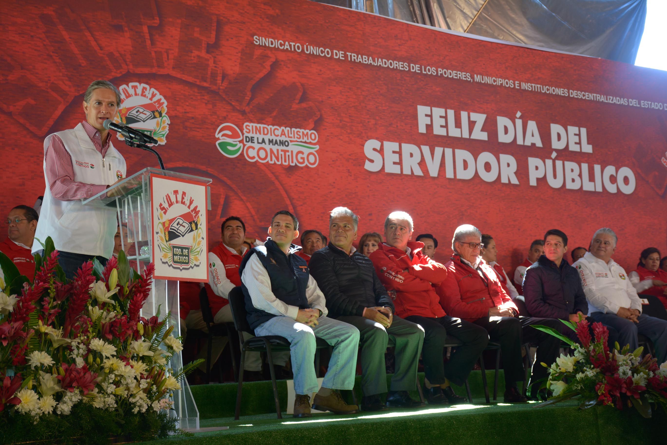 Por su parte, el Lic. Alfredo del Mazo Maza aseguró a los suteymistas que su administración se encargará de ampliar y proteger los derechos de los servidores públicos sindicalizados, se fortalecerá el sistema escalafonario, los servicios de salud y en especial el Fondo de Apoyo a la Vivienda para otorgar a los trabajadores el patrimonio que tanto anhelan.