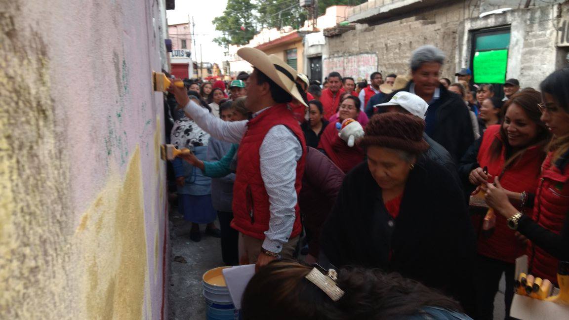 En una intensa gira de trabajo, el presidente municipal de Zinacantepec, Manuel Castrejón Morales, inicio con la pinta de fachadas en una segunda etapa, en las comunidades de Santa Cruz Cuauhtenco, San Juan de las Huertas, San Cristóbal Tecolit, San Antonio Acahualco, Cabecera Municipal, San Luis Mextepec y Santa María del Monte, como parte del programa Empleo Temporal, con el objetivo de mejorar la imagen urbana de las localidades del municipio invirtiendo para estos trabajos 6 millones de pesos.Durante los eventos, el alcalde destacó “La ampliación del programa para llegar a mas a comunidades se debe al respaldo del presidente de la República Mexicana, Enrique Peña Nieto y del gobernador del Estado de México, Eruviel Ávila Villegas, que siempre impulsan acciones en beneficio de todos los mexiquenses ya que además de renovar la imagen urbana se fomenta el empleo al utilizar mano de obra zinacantepequense” asentó.