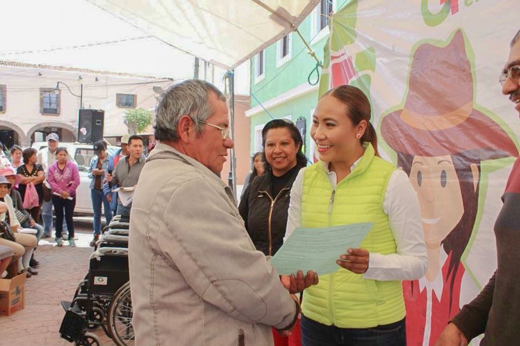 Ante cientos de beneficiarios, la integrante de la Comisión Legislativa de Asuntos Indígenas entregó vales para fertilizante gestionados ante la Secretaría de Desarrollo Agropecuario, así como sillas de ruedas, andaderas y bastones para adultos mayores.