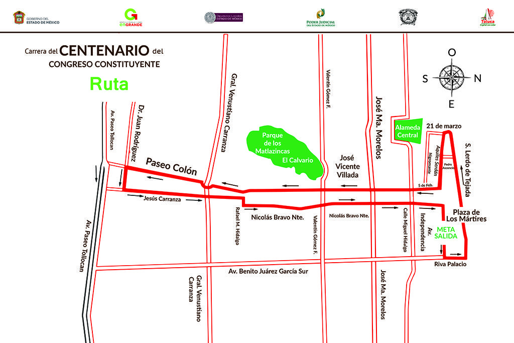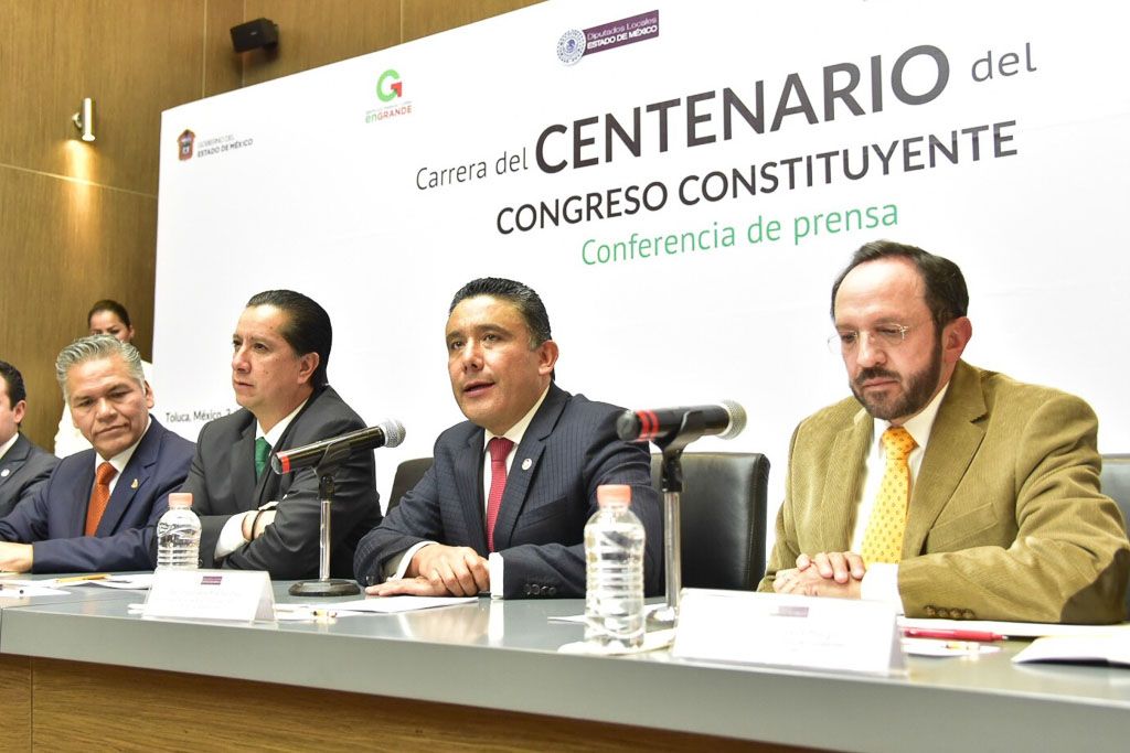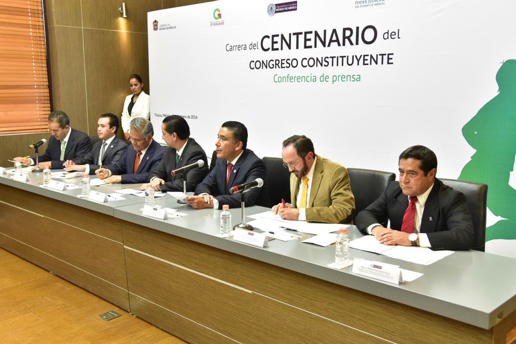 Los poderes Legislativo, Ejecutivo y Judicial, la Universidad Autónoma del Estado de México (UAEM) y el ayuntamiento de Toluca convocaron a participar en la Carrera del Centenario del Congreso Constituyente, actividad deportiva y recreativa que tendrá lugar el próximo domingo 21 de febrero, a partir de las 08:00 horas, y cuyo recorrido abarcará diversas vialidades de la zona centro de la capital del Estado de México.En conferencia de prensa, el presidente de la Junta de Coordinación Política de la LIX Legislatura, diputado Cruz Roa Sánchez; el secretario de Cultura, Eduardo Gasca Pliego; el rector de la UAEM, Jorge Olvera García; el magistrado Otoniel Campirán Pérez, representante del presidente del Tribunal Superior de Justicia, Sergio Medina Peñaloza, así como el presidente municipal de Toluca, Fernando Zamora Morales, dieron a conocer que este evento deportivo, propuesto por la Legislatura estatal, forma parte de las actividades conmemorativas del Centenario del Congreso Constituyente.