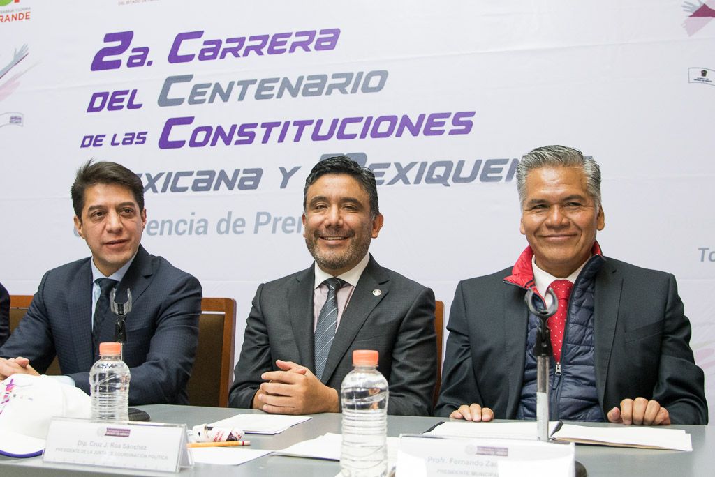 La 59 Legislatura mexiquense, la Secretaría de Cultura estatal, el Tribunal Superior de Justicia (TSJEM), la Universidad Autónoma del Estado de México (UAEM) y el ayuntamiento de Toluca convocaron a la Segunda Carrera del Centenario de las Constituciones Mexicana y Mexiquense, que se realizará en Toluca el próximo 12 de febrero, como parte de las actividades para conmemorar los primeros 100 años de ambas constituciones.“Una vez más nos hemos organizado de manera interinstitucional para llevar a cabo la segunda carrera con motivo del Centenario de nuestras constituciones”, dijo el diputado Cruz Roa Sánchez, presidente de la Junta de Coordinación Política, en conferencia de prensa con el magistrado presidente del TSJEM, Sergio Javier Medina Peñaloza; el alcalde de Toluca, Fernando Zamora Morales, y el director general de Cultura Física y Deporte de la Secretaría de Cultura de la entidad, Fernando Platas Álvarez.