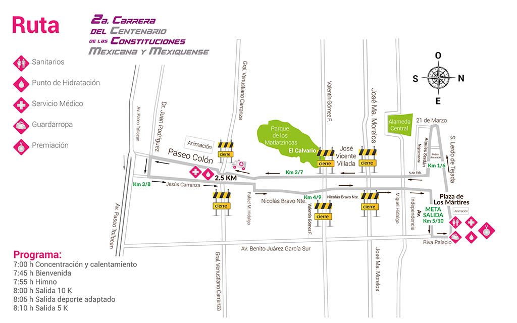 La carrera iniciará en la Calle Independencia, a la altura del Palacio Municipal de Toluca, y recorrerá las calles de Riva Palacio, Sebastián Lerdo de Tejada, 21 de Marzo, Aquiles Serdán, Paseo Colón, Dr. Juan Rodríguez, Jesús Carranza, Rafael M. Hidalgo, Nicolás Bravo y tendrá como meta el mismo punto de partida. Los cortes de circulación ese día serán de las de 6:00 a 10:00 horas.
