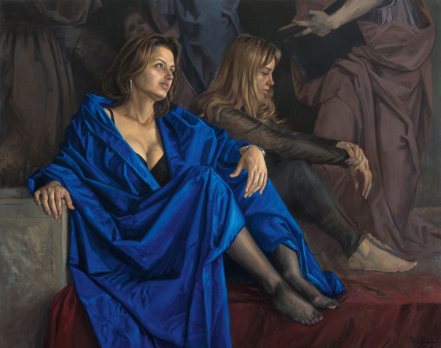 Darío Ortíz (Ibagué, 1968), trabaja en un figurativismo narrativo que explora la condición humana; para materializar el argumento el pintor hace uso de una depurada técnica que flirtea con el surrealismo y la teatralidad de la antigüedad clásica, uniendo las legendarias prácticas del hombre con aquellas propias de la actualidad, poniendo de manifiesto una crítica a la paradójica situación del hombre contemporáneo y su acelerada existencia. El cruce de prendas, acciones y costumbres entre siglos, vuelve inciertas las certezas y apela a una profunda reflexión respecto de las estrictas leyes de lo terrenal.