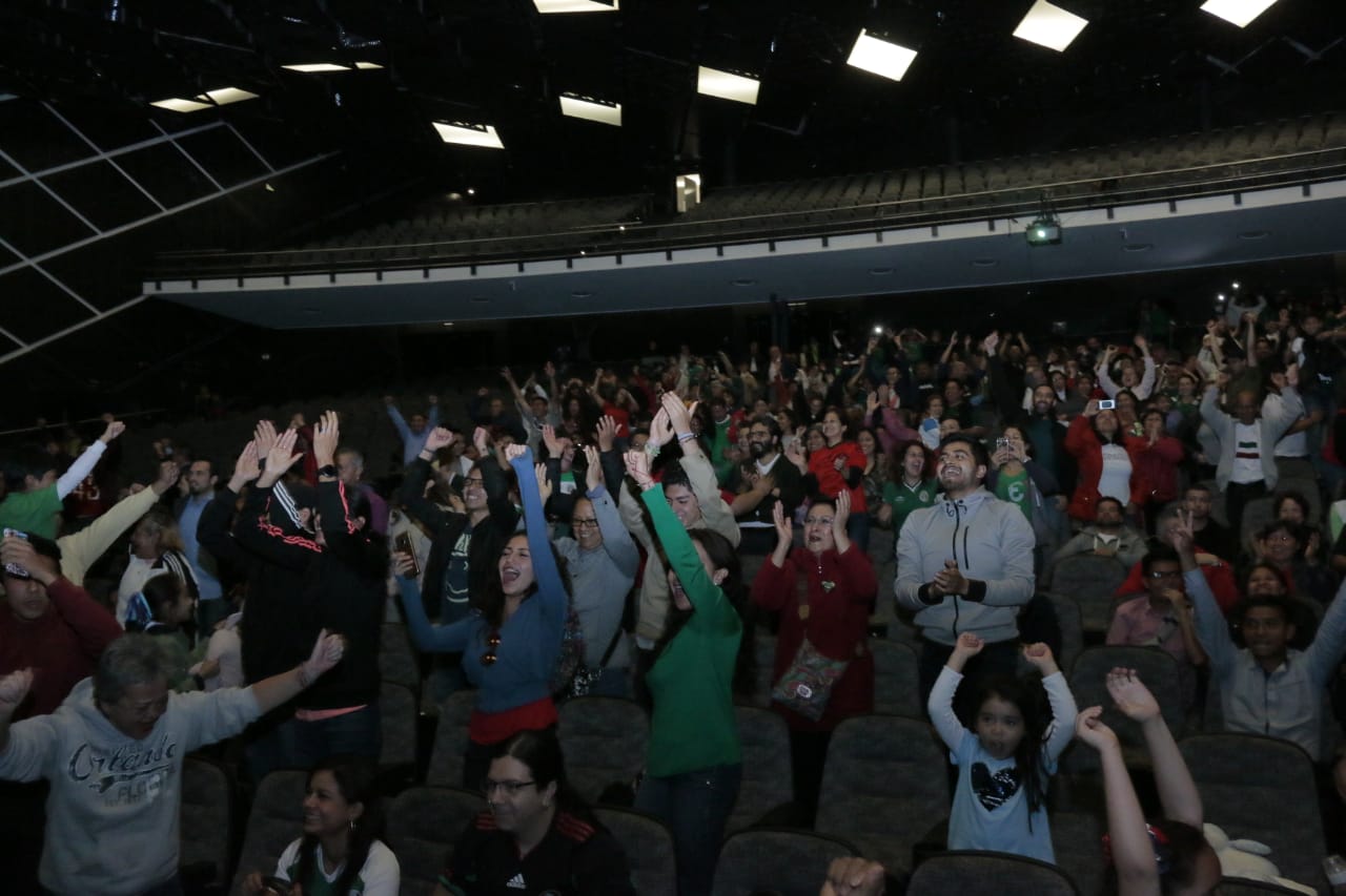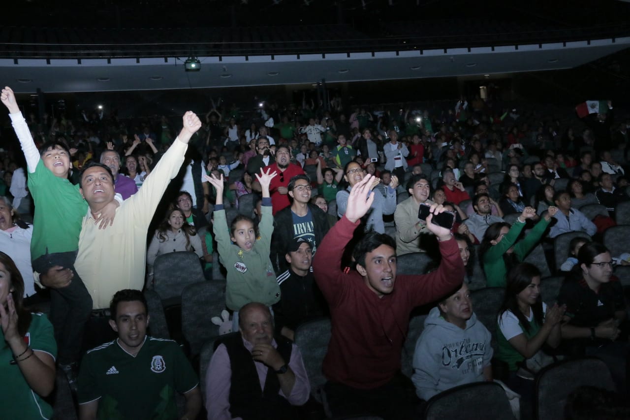 Toluca, Estado de México.- El Teatro Morelos se vistió de verde, con miles de aficionados que asistieron a presenciar la transmisión del partido de la Selección Mexicana frente al equipo de Alemania en el Mundial de Futbol Rusia 2018. Las porras, aplausos, gritos de júbilo y alegría no se hicieron esperar cuando cayó el primer gol y el único tanto del partido que a la postre dio la victoria al representativo mexicano con marcador histórico de 1-0.