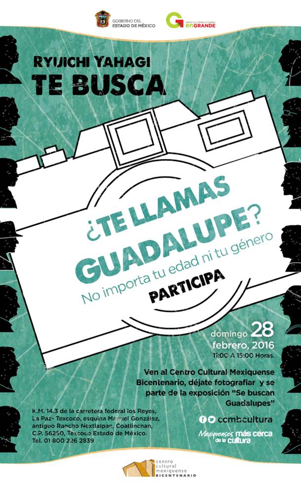 El Centro Cultural Mexiquense Bicentenario (CCMB) abre la convocatoria ¿Te llamas Guadalupe? por parte del artista japonés Ryuichi Yahagi, quien busca a personas que lleven por nombre Guadalupe para que participen en su exposición fotográfica, un trabajo en conjunto con el Gobierno del Estado de México a través de la Secretaria de Cultura, promoviendo la participación de los mexiquenses en los proyectos artísticos y enalteciendo la identidad mexicana.Este proyecto inició en 2006 en Japón, donde se convocó a las personas con los nombres más comunes en ese país, como Yamamoto, Ito, Sato y Suzuki, quienes se tomaron una fotografía para formar la exposición que se pudo ver en diversas galerías y foros de arte.