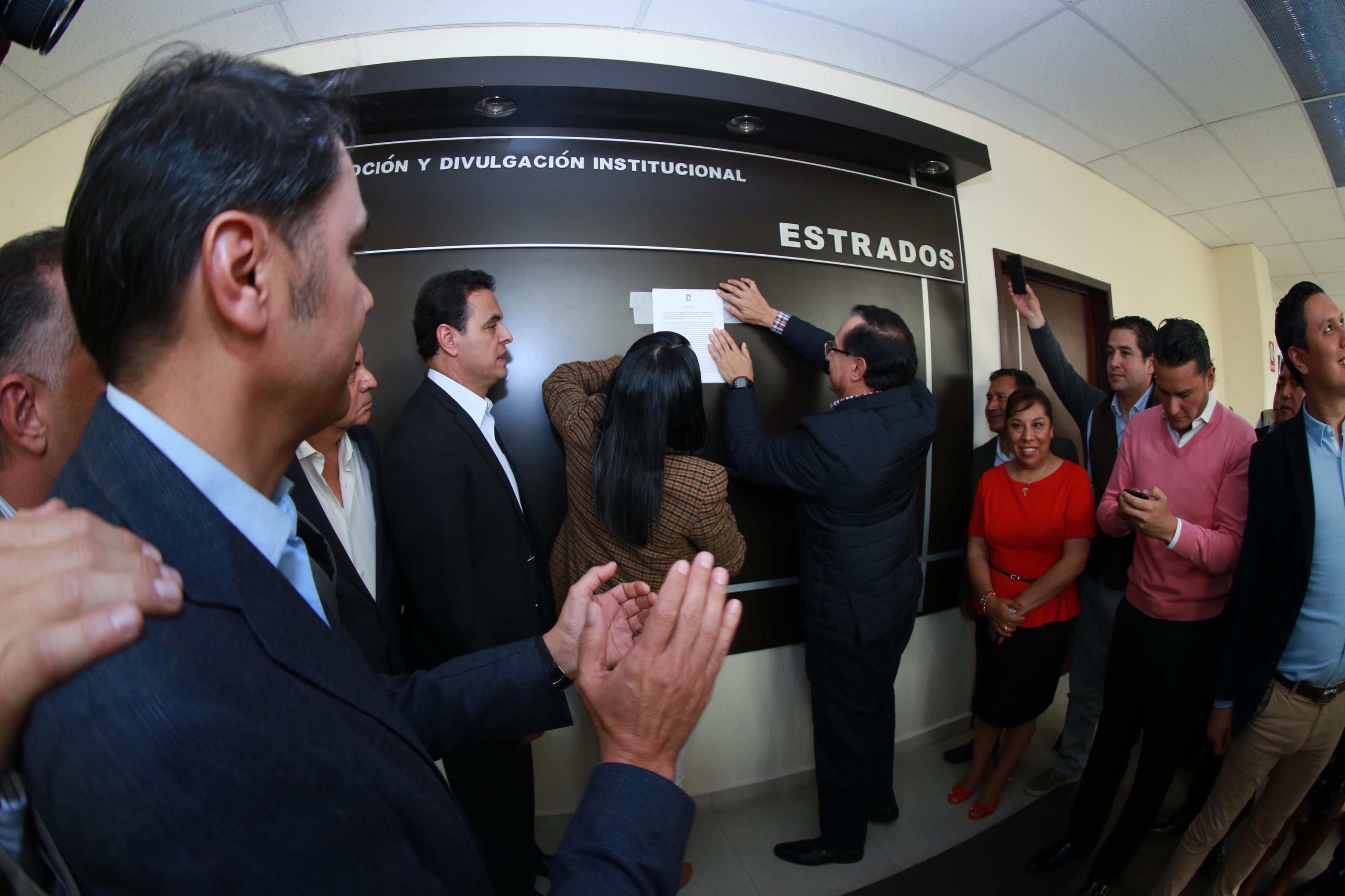 Acompañada por Raymundo Martínez Carbajal, secretario general del PRI mexiquense, del delegado del Comité Ejecutivo Nacional del PRI en la entidad, Ismael Hernández Deras, así como de integrantes de los sectores y organizaciones del partido, Del Moral Vela colocó en los estrados de la sede estatal del PRI el documento que establece el método para elegir a quien concluirá el periodo estatutario 2015- 2019.