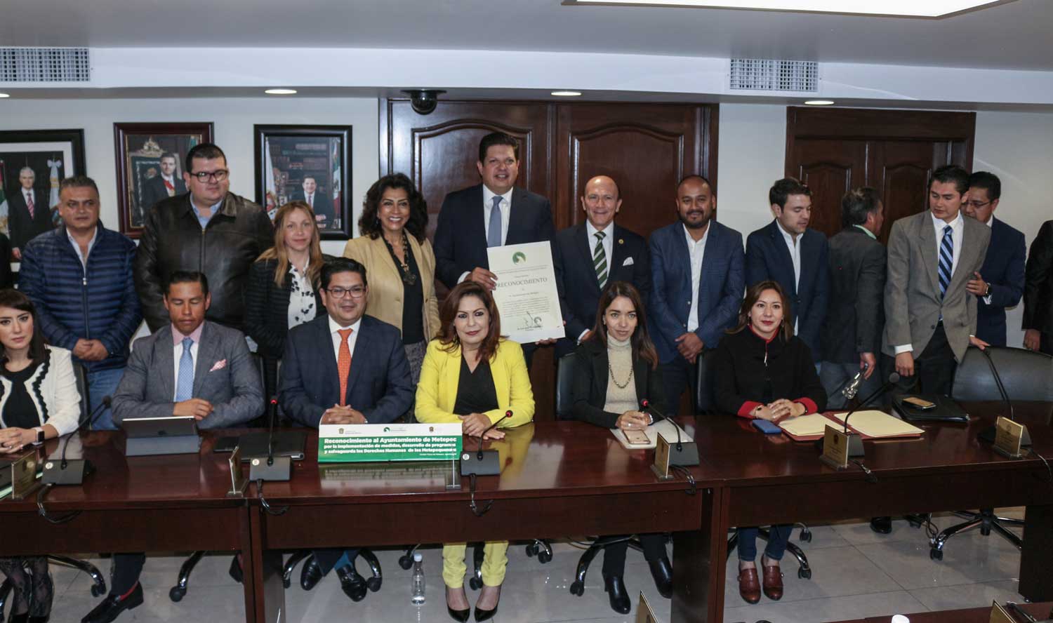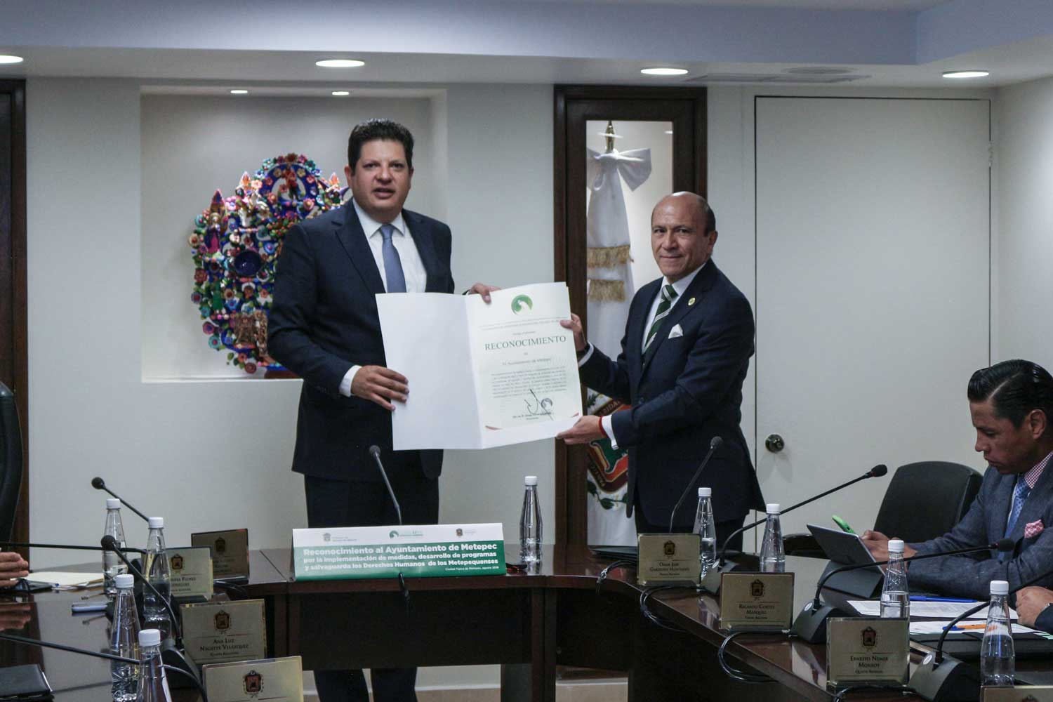 Metepec, México.- El Primer Visitador General de la Comisión de Derechos Humanos del Estado de México (Codhem), José Benjamín Bernal Suárez, en representación del ombudsperson mexiquense Jorge Olvera García, entregó al presidente municipal David López Cárdenas, un reconocimiento al ayuntamiento de Metepec por la implementación de Medidas Positivas y Compensatorias en 2018, que favorecen a los grupos en situación de vulnerabilidad, y exhortó a mantener la ruta del trato digno hacia las personas.