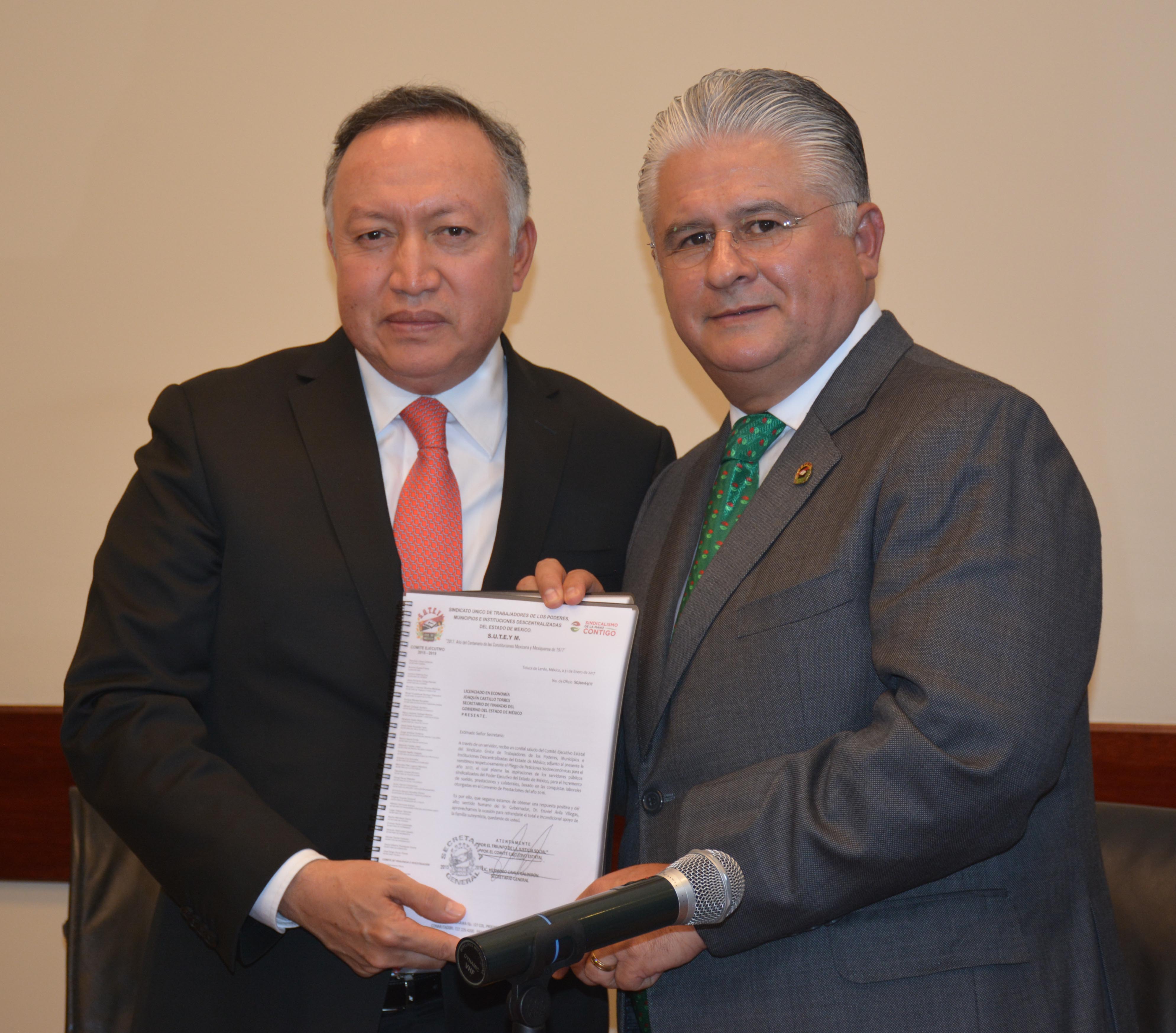 En el Palacio de Gobierno del Estado de México, el Lic. Herminio Cahue Calderón, Secretario General del SUTEYM, entregó el Pliego Petitorio 2017 al Secretario de Finanzas de la entidad, Lic. Joaquín Castillo Torres; estando presentes el Lic. Mario Alberto Quezada Aranda, Subsecretario de Administración; Lic. Marco Antonio Cabrera Acosta, Director General de Personal; e integrantes del Comité Ejecutivo Estatal del sindicato. El Secretario General del SUTEYM dijo que el pliego de peticiones contempla salario, colaterales y prestaciones de ley. Aseveró que al estar conscientes de la situación económica que vive la entidad y el país, se realizó un estudio exhaustivo de lo que consideran es posible que fortalezca la administración que encabeza el Dr. Eruviel Ávila Villegas, Gobernador del estado.