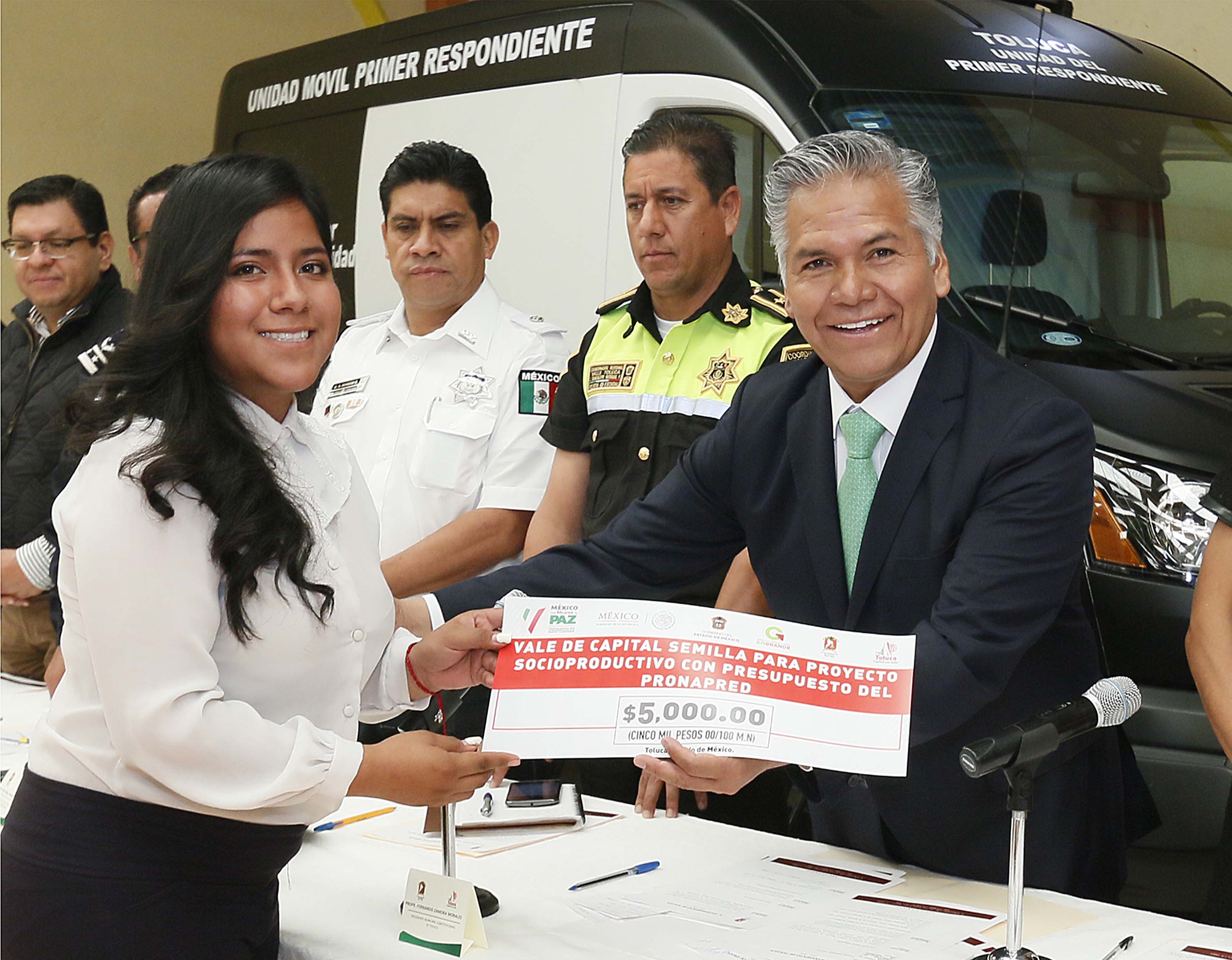 De igual forma, hizo entrega de cheques a los participantes en actividades socioproductivas de autoempleo, en los polígonos del Programa Nacional para la Previsión Social de la Violencia y la Delincuencia, entre las que se ubican las delegaciones de San Lorenzo Tepaltitlán, Barrios Tradicionales y Seminario Conciliar, además de 190 juegos de mesa y 80 memoramas destinados a tres escuelas de San Cristóbal Huichochitlán, como parte de las actividades que se realizan en materia de prevención social y de cultura de paz entre la población escolar.