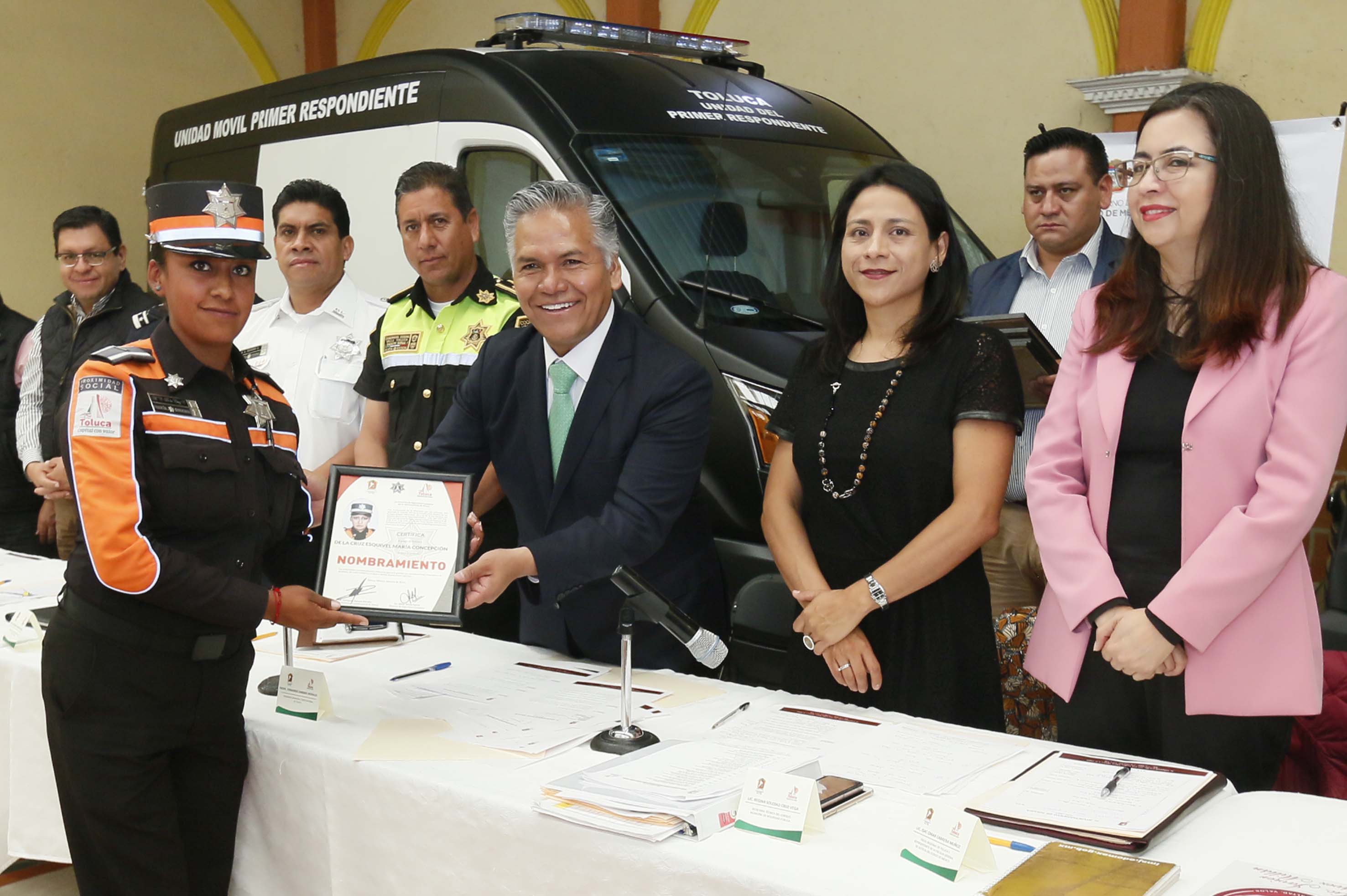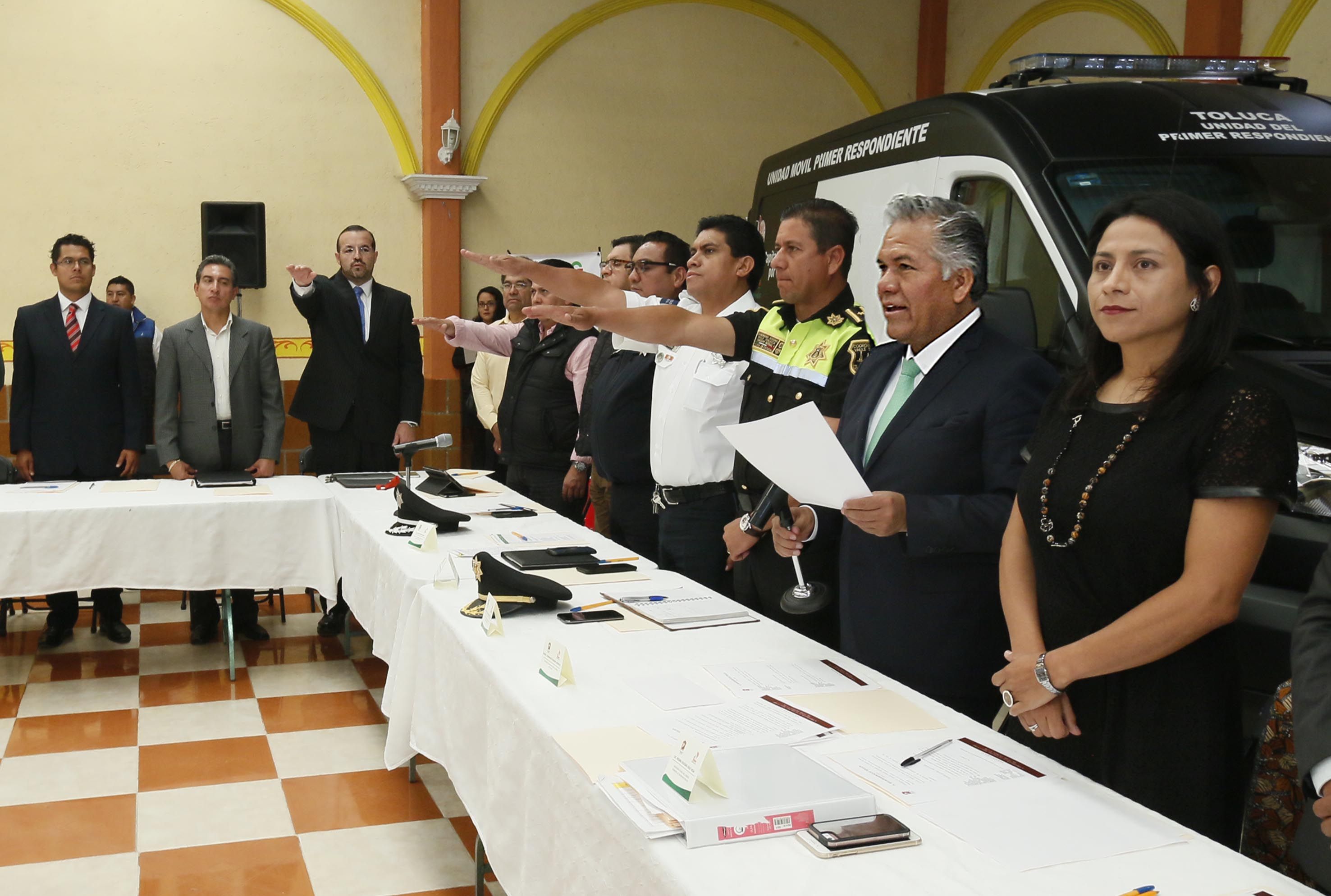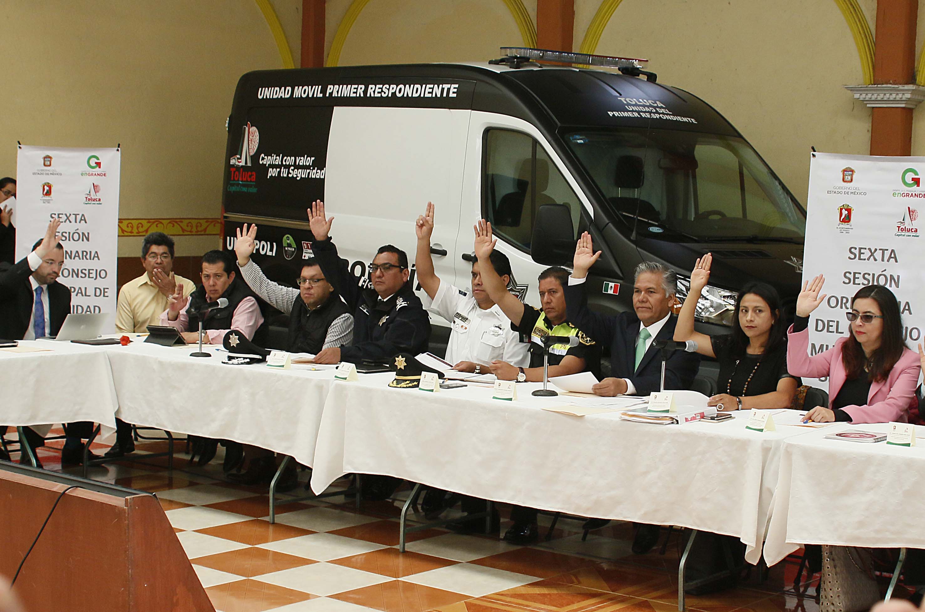 Autoridades auxiliares de Toluca reconocieron, durante la sexta sesión ordinaria del Consejo Municipal de Seguridad Pública, el cumplimiento de acuerdos y acciones que se realizan en esta materia en las diversas localidades de la capital mexiquense, marco en que el alcalde Fernando Zamora Morales entregó unidades de primer respondiente, nombramientos a policías y apoyos económicos a participantes en actividades socioproductivas.Ante representantes de la Secretaría de la Defensa Nacional, Policía Federal, Comisión Estatal de Seguridad Ciudadana, Secretariado Ejecutivo del Sistema Estatal de Seguridad Pública, delegados de San Cristóbal Huichochitlán, San Lorenzo Tepaltitlán, Seminario Conciliar y Tlachaloya agradecieron a la administración local el cumplimiento de acuerdos pactados en las sesiones anteriores.
