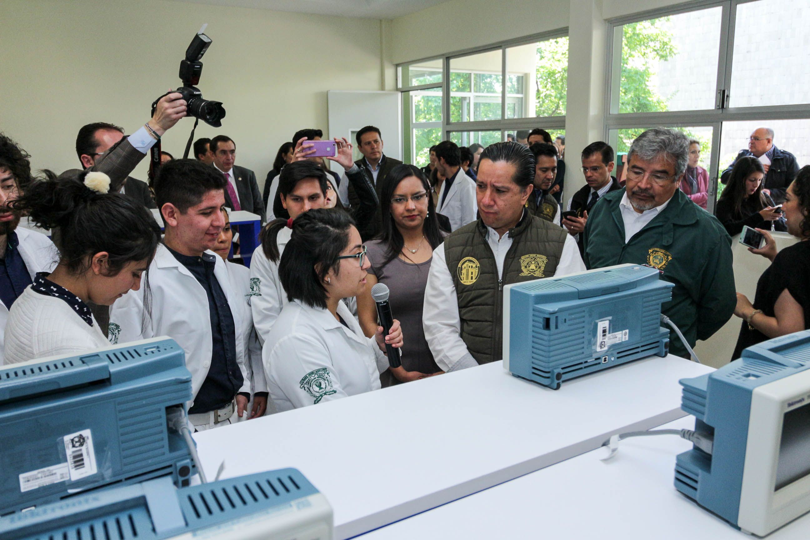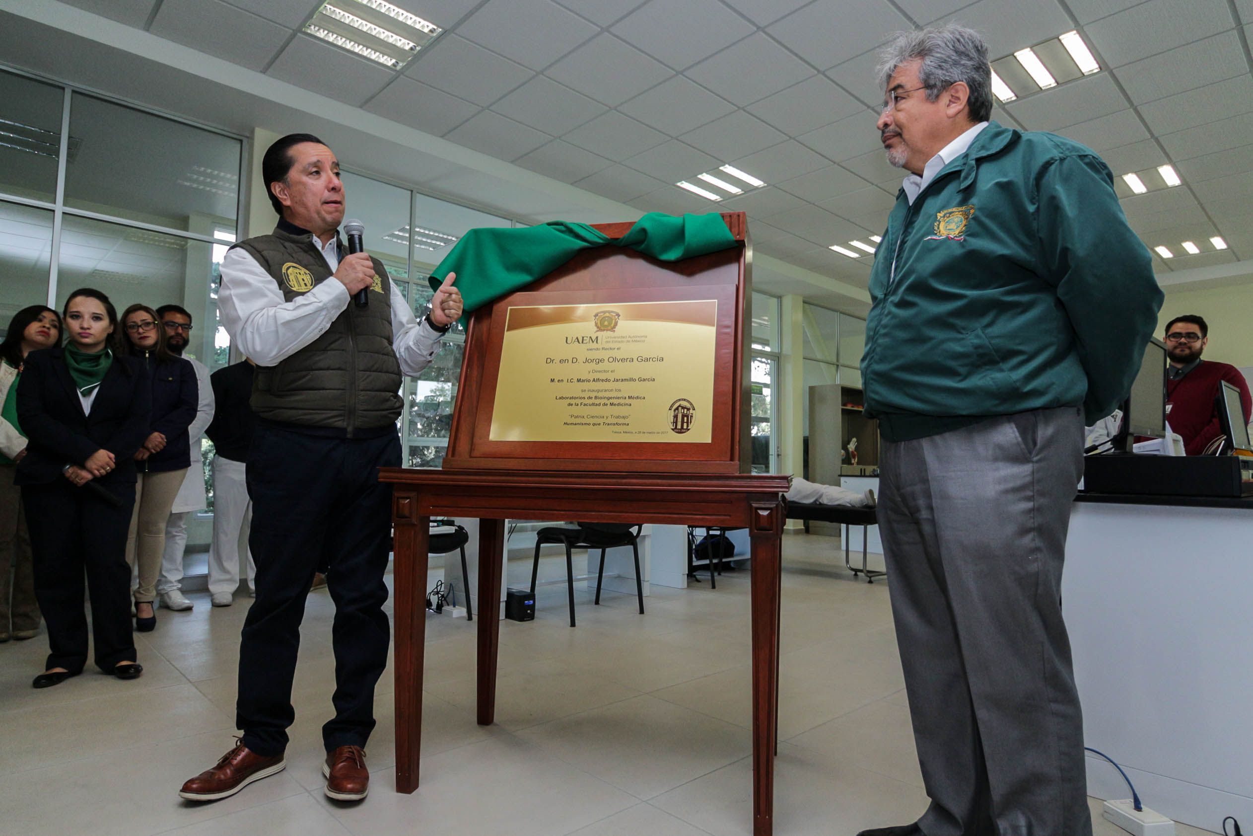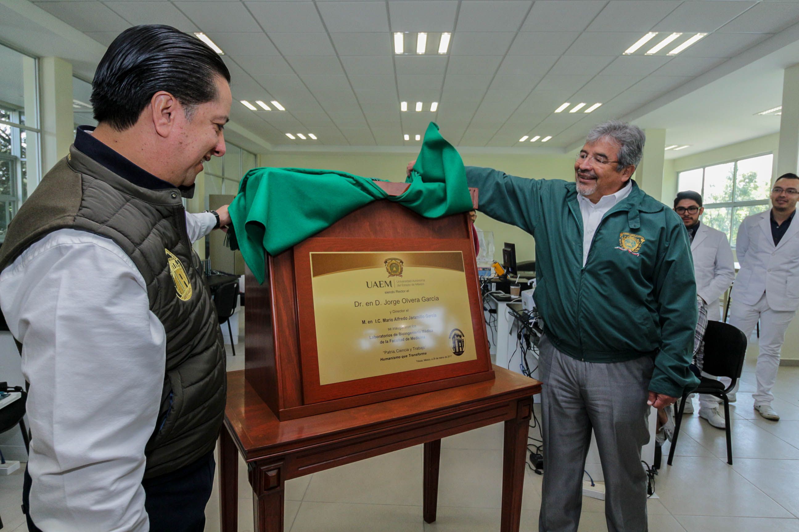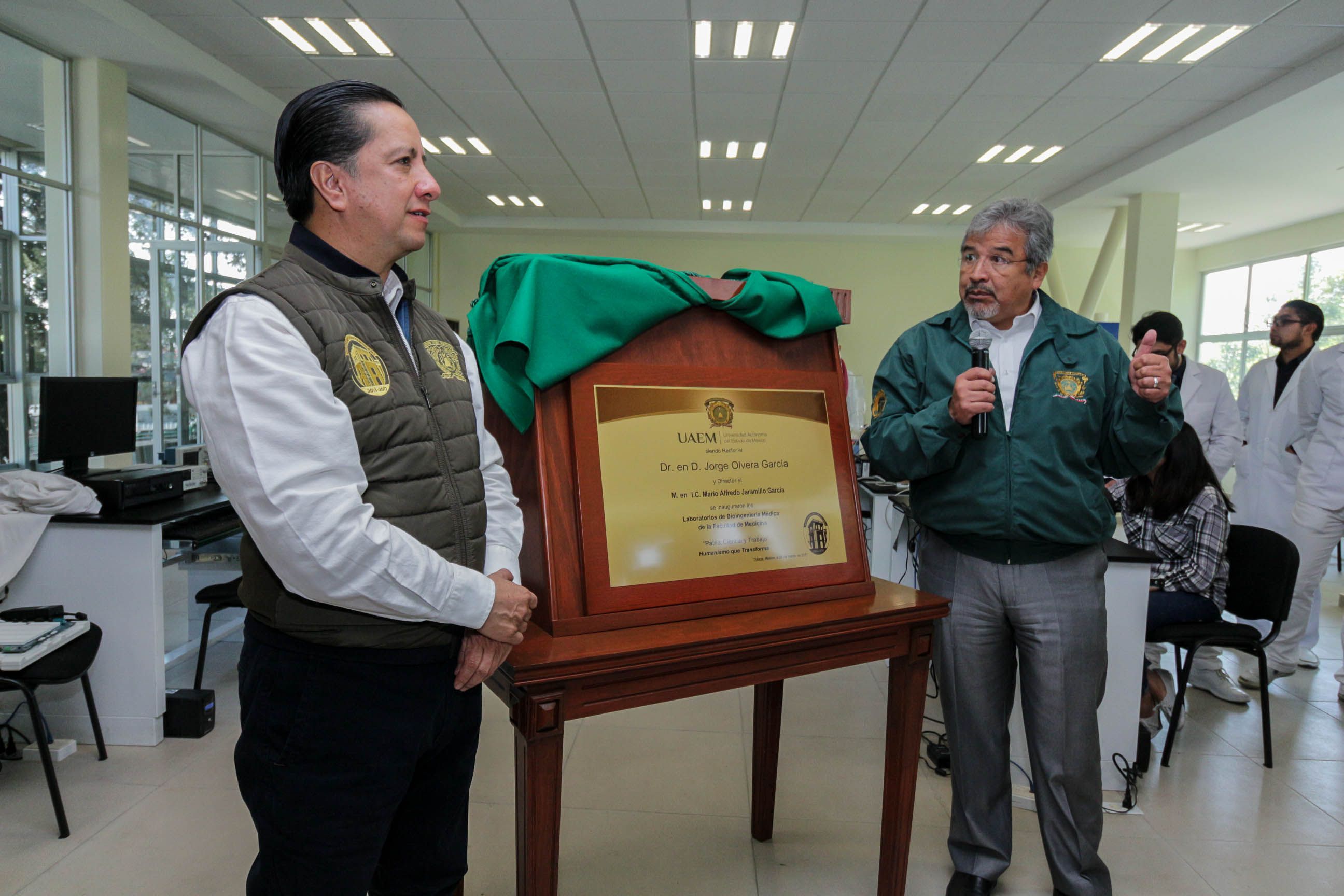 La Universidad Autónoma del Estado de México es una institución pertinente, progresista y que responde a las demandas del mercado laboral, al ofertar carreras únicas y sumamente innovadoras, puntualizó el rector Jorge Olvera García, durante la inauguración, en la Facultad de Medicina, de infraestructura por un monto cercano a los 13 millones de pesos, en beneficio de los estudiantes de la Licenciatura en Bioingeniería Médica.Acompañado de los secretarios de Administración, Javier González Martínez, y Técnico de Rectoría, Jorge Bernáldez García, así como el director de este organismo universitario, Mario Alfredo Jaramillo García, Jorge Olvera develó la placa inaugural del Laboratorio de Adquisición y Tratamiento de Señales Fisiológicas, en apoyo al diagnóstico médico; el Laboratorio de Modelado o Sala de Cómputo, que cuenta con una impresora 3D, y el Laboratorio de Electrónica, además de aulas y cubículos para Profesores de Tiempo Completo, en beneficio de los 240 alumnos que integran la matrícula de la Licenciatura en Bioingeniería Médica.
