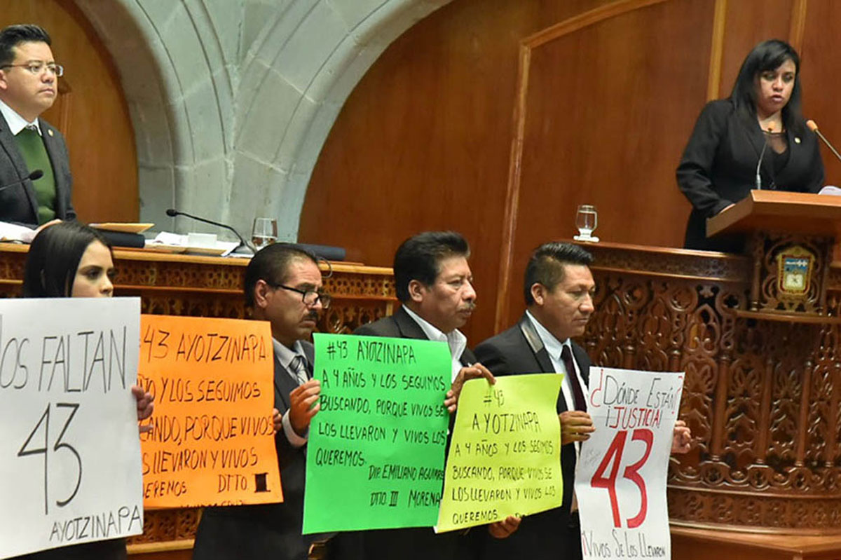 “Repudiamos enérgicamente los hechos ocurridos en Ayotzinapa, Guerrero, el 26 y 27 de septiembre de 2014, en donde desaparecieron 43 estudiantes de la Escuela Normal ‘Raúl Isidro Burgos’ y seis personas más que perdieron la vida, sin que hasta la fecha las autoridades competentes hayan actuado dentro del marco convencional, constitucional y legal para esclarecer lo sucedido, dar con el paradero de las víctimas y sancionar a los responsables”, expresó desde la tribuna.
