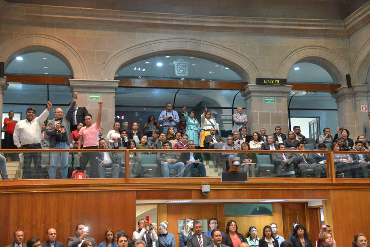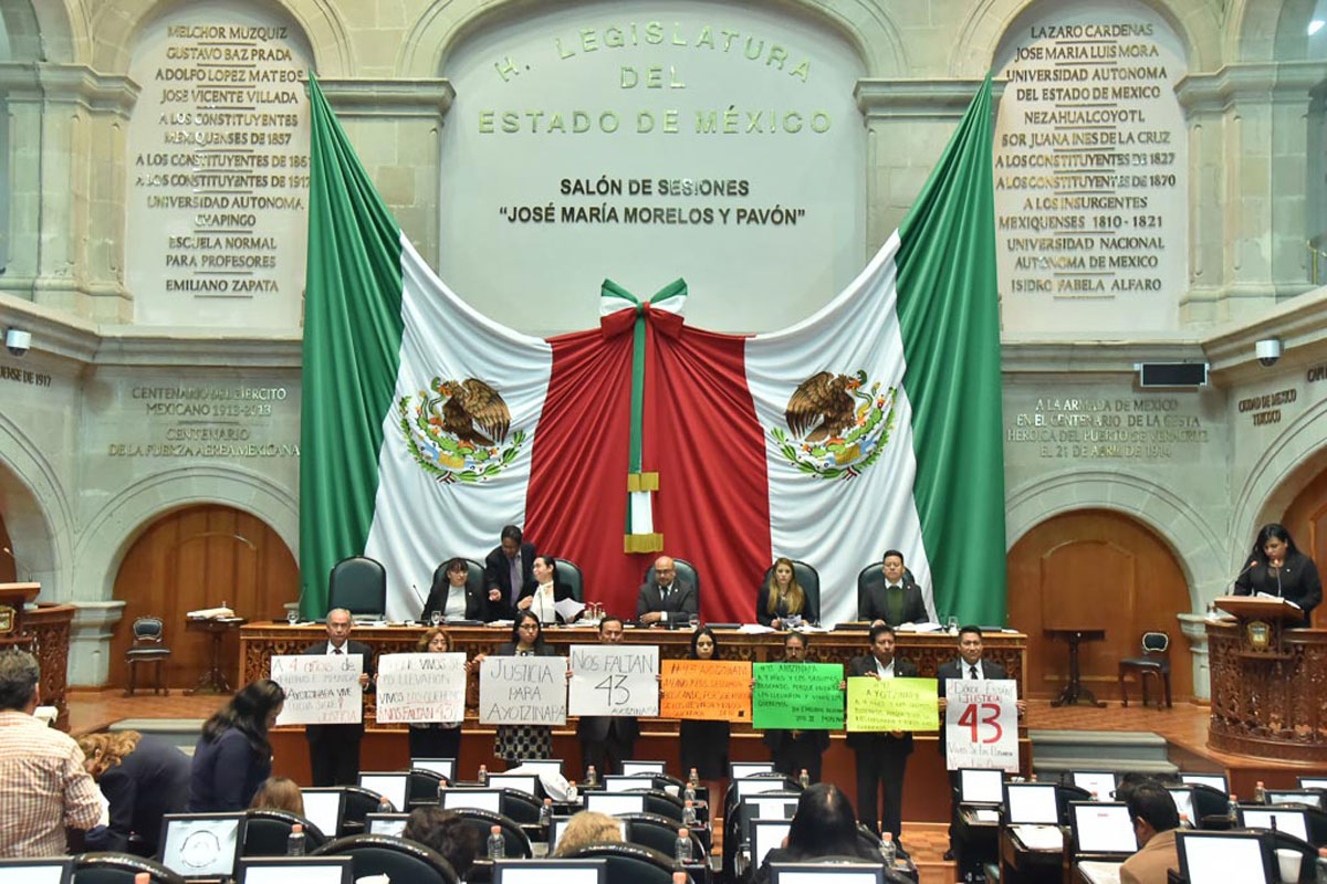 En presencia de Lenin Bernabé Mondragón Fontes y Cuitláhuac Mondragón Fontes, familiares del normalista mexiquense Julio César Mondragón Fontes, asesinado durante los hechos, la diputada morenista Violeta Nova Gómez leyó el pronunciamiento de su bancada, al mismo tiempo que sus compañeros mostraron pancartas con mensajes de justicia para los estudiantes y expresaron: “vivos se los llevaron, vivos los queremos”.