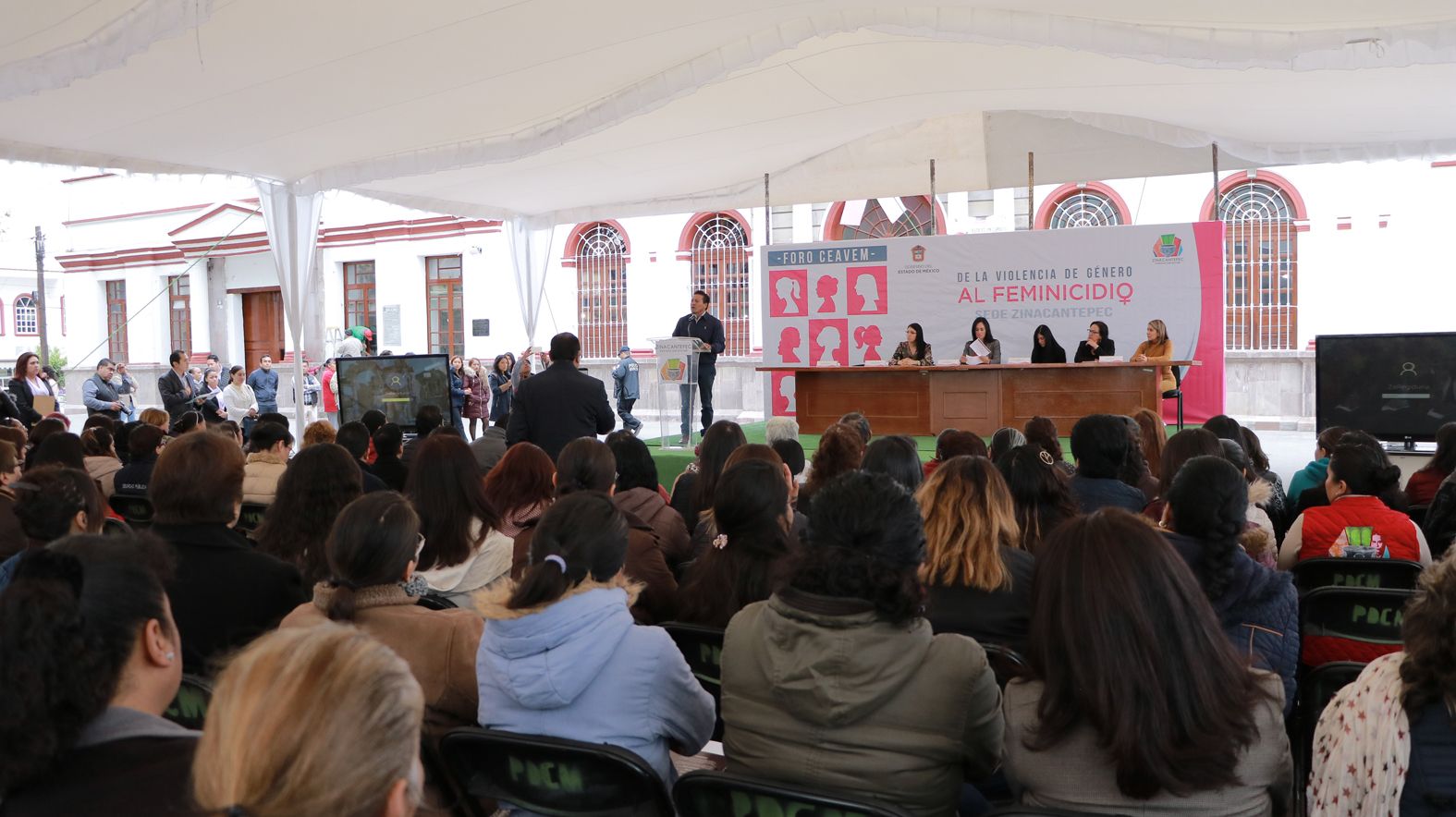 Con la finalidad de impulsar acciones para erradicar la violencia de género, el gobierno municipal de Zinacantepec, en coordinación con el gobierno del Estado de México, a través de la Comisión Ejecutiva de Atención a Víctimas, llevó a cabo el Foro “De la Violencia de Género al Feminicidio” en la Plaza Cívica.En el evento, el alcalde Manuel Castrejón Morales, expresó “Este foro es un tema de seguridad nacional, porque es un mal que afecta al mundo entero por ello es una obligación de todo gobierno estar atento para erradicar y prevenir la violencia de género y el feminicidio” puntualizó.