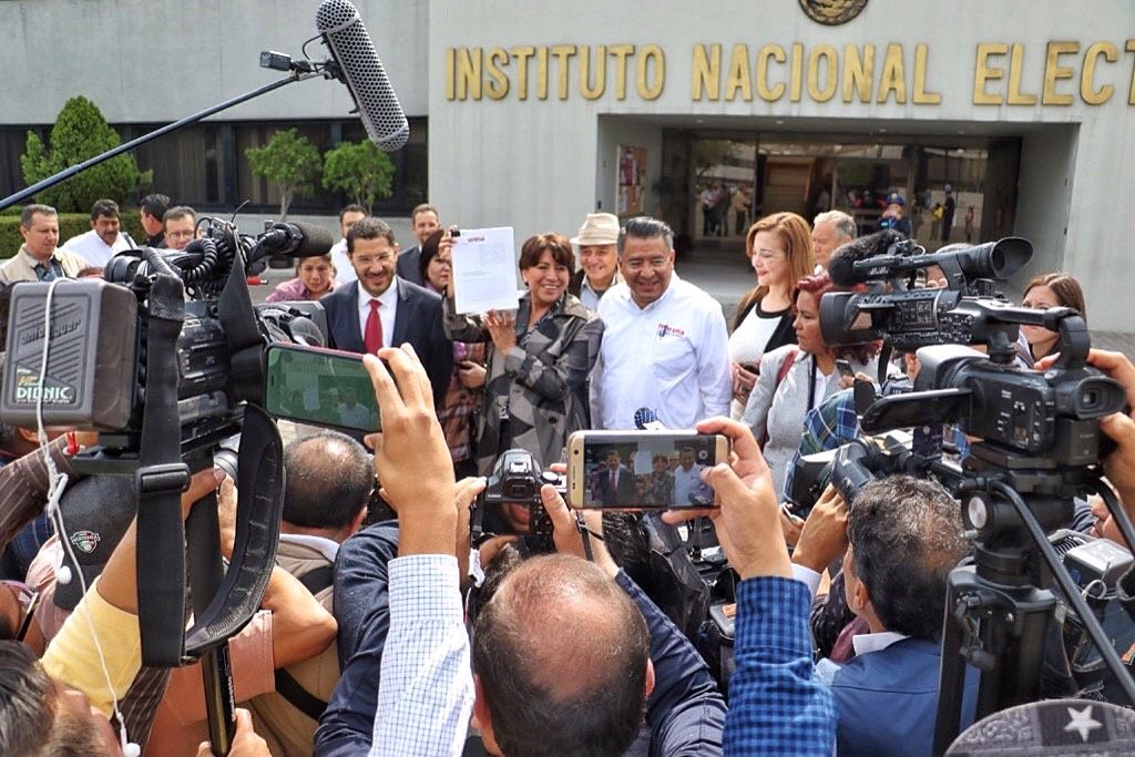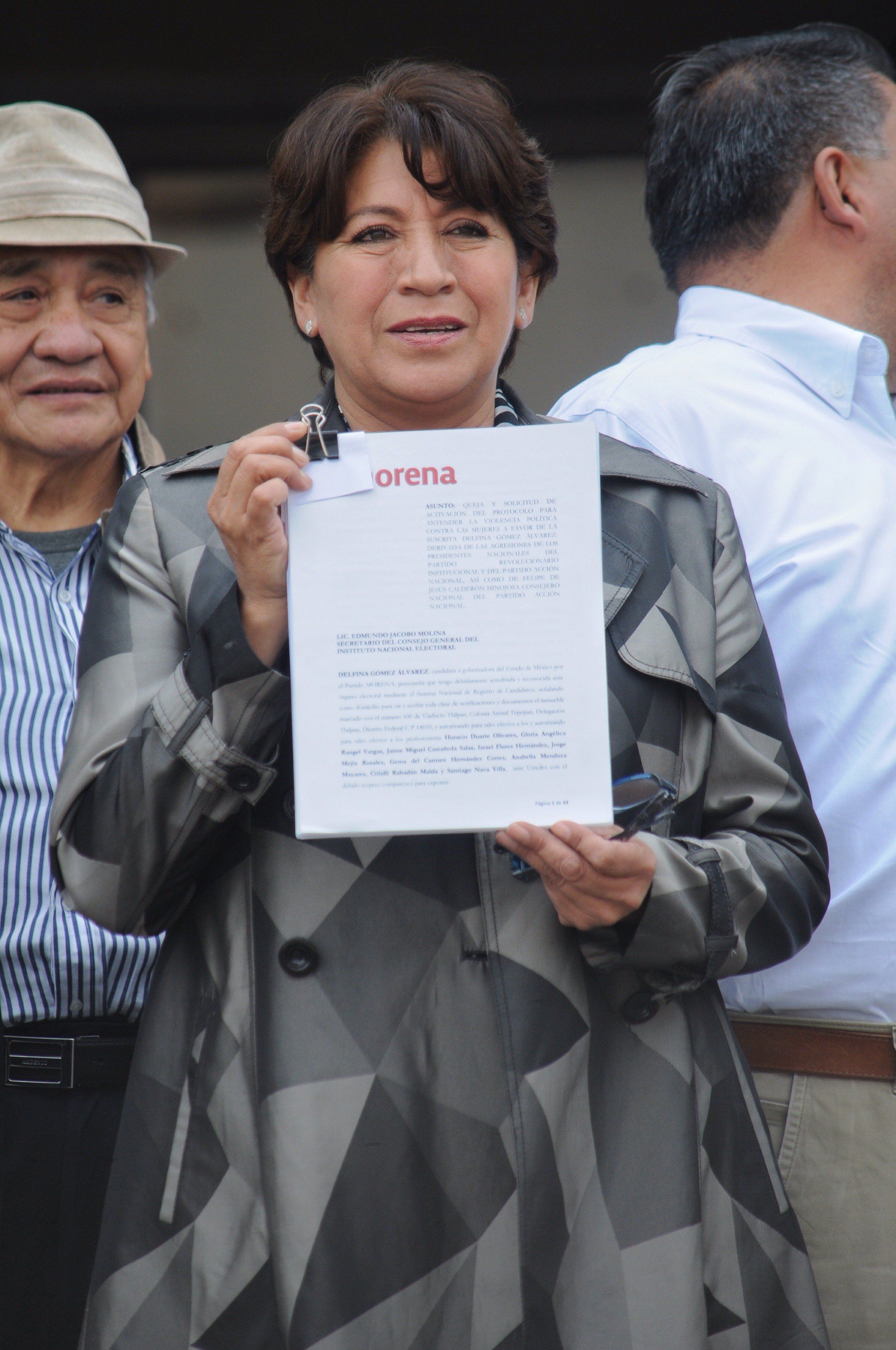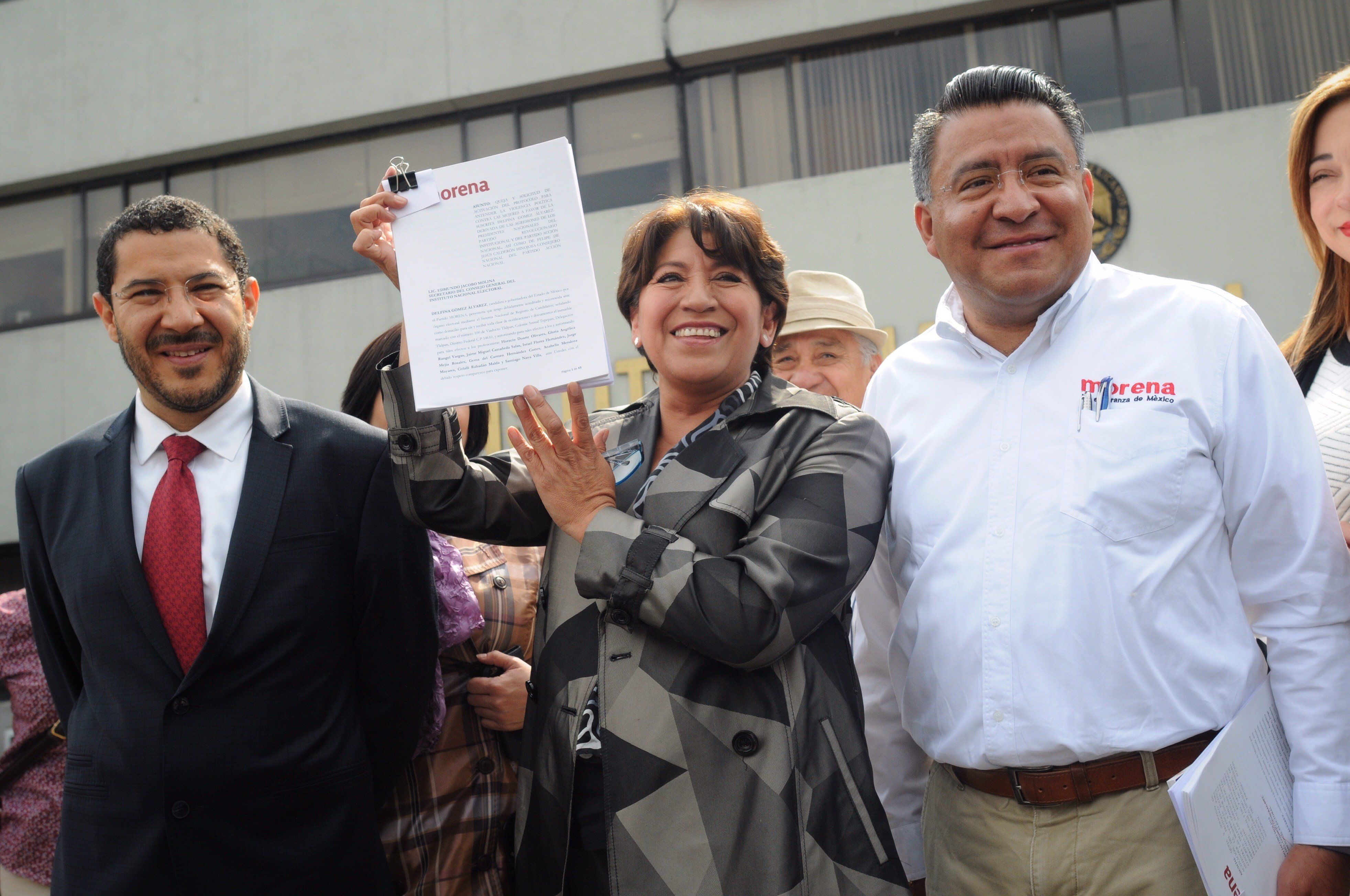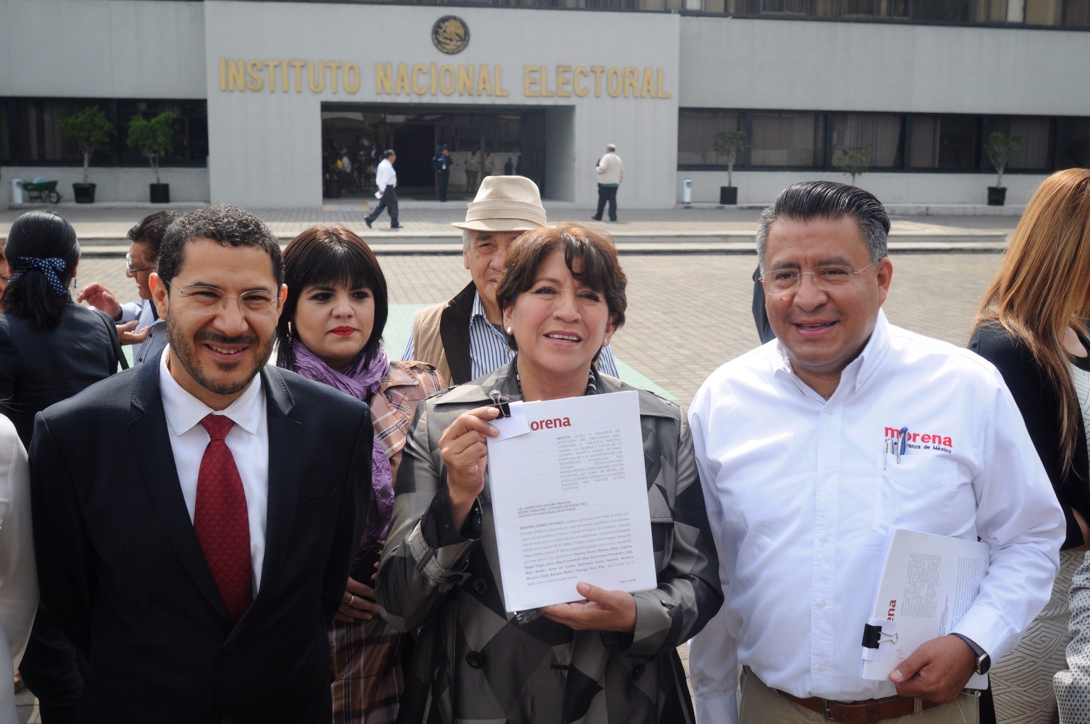 La candidata de Morena a la gubernatura del Estado de México, Delfina Gómez Álvarez, denunció ante el Instituto Nacional Electoral (INE) a los dirigentes nacionales del PRI y del PAN, así como al ex presidente Felipe Calderón, por haber ejercido violencia de género en su contra.Acompañada por legisladoras y líderes de su partido, Gómez Álvarez acudió al INE para solicitar que el instituto active el protocolo para atender la violencia política contra las mujeres a fin de que cese esta campaña de discriminación y desprestigio en su contra.