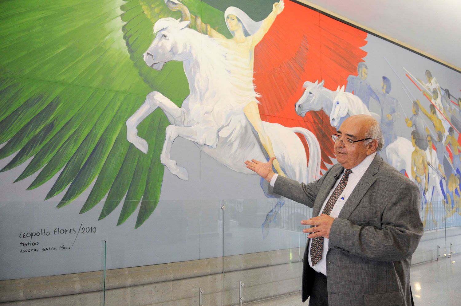 Para conocer el mural, “La Independencia de México”, de Leopoldo Flores Valdez, hay que subir al segundo piso, y Gustavo Ramírez detalla que este mural es todo de color gris, rojo y azul, excepto la parte donde se puede ver a “La Patria”, una figura humana montada en un caballo blanco, que representa a la nación liberada.