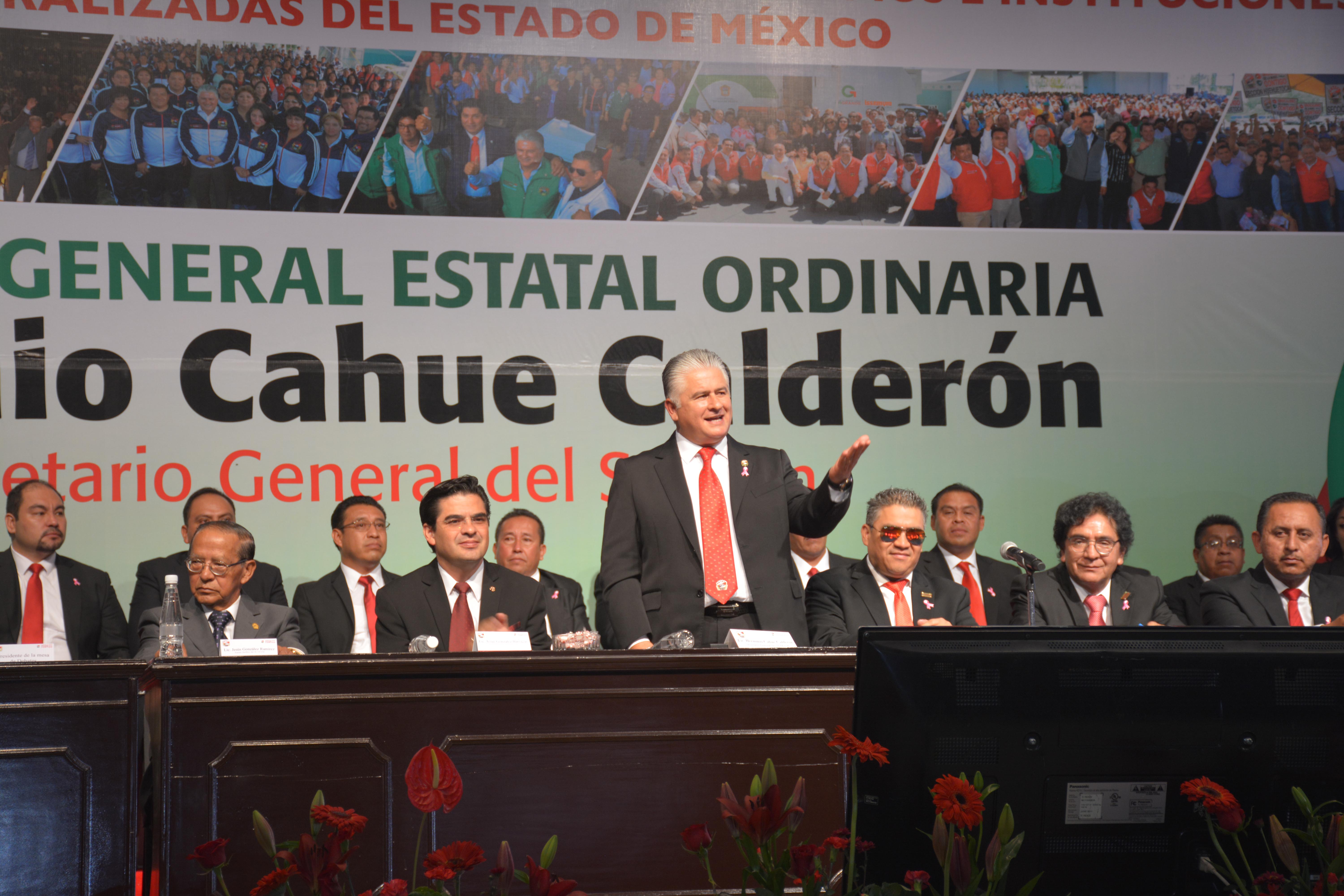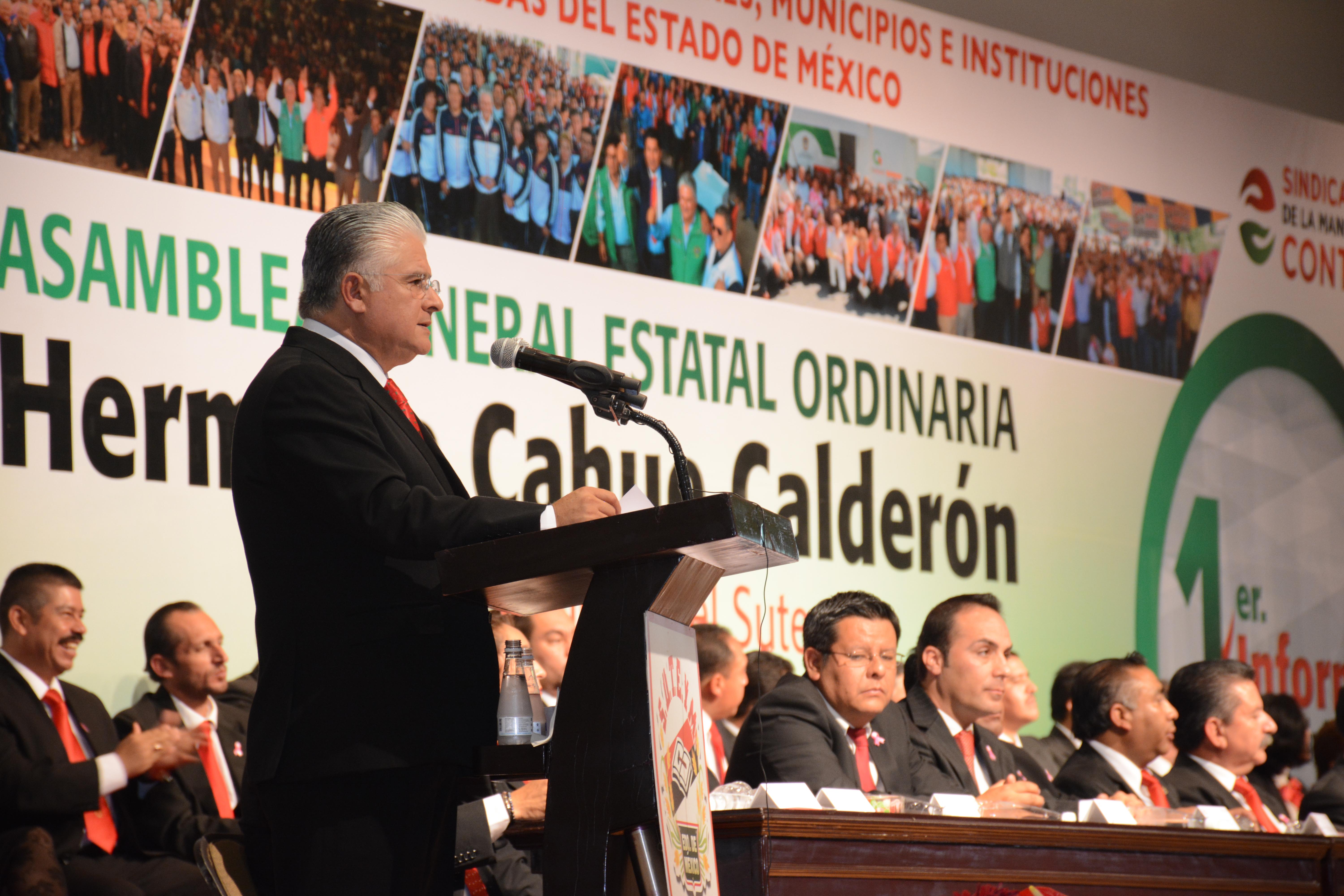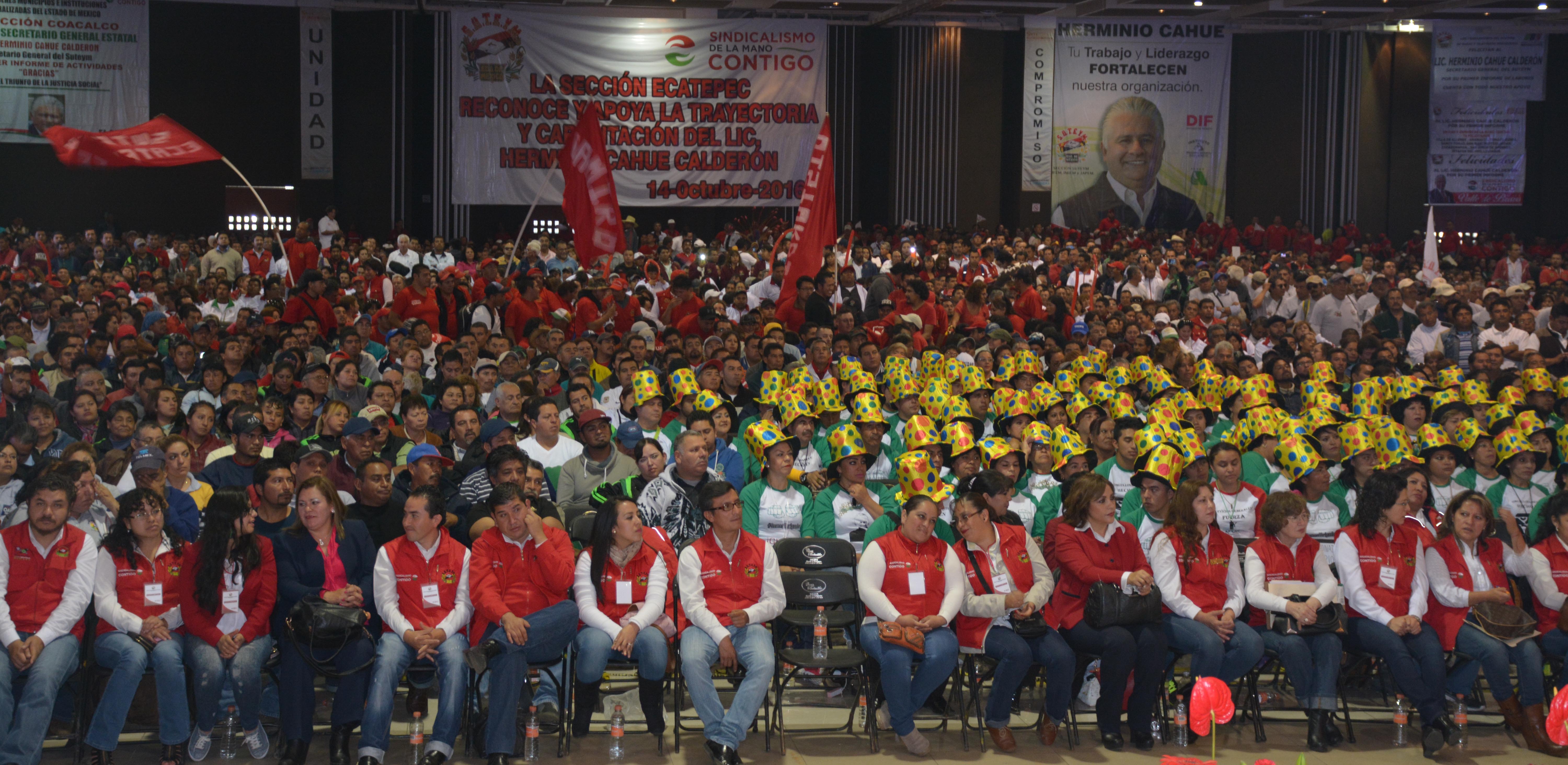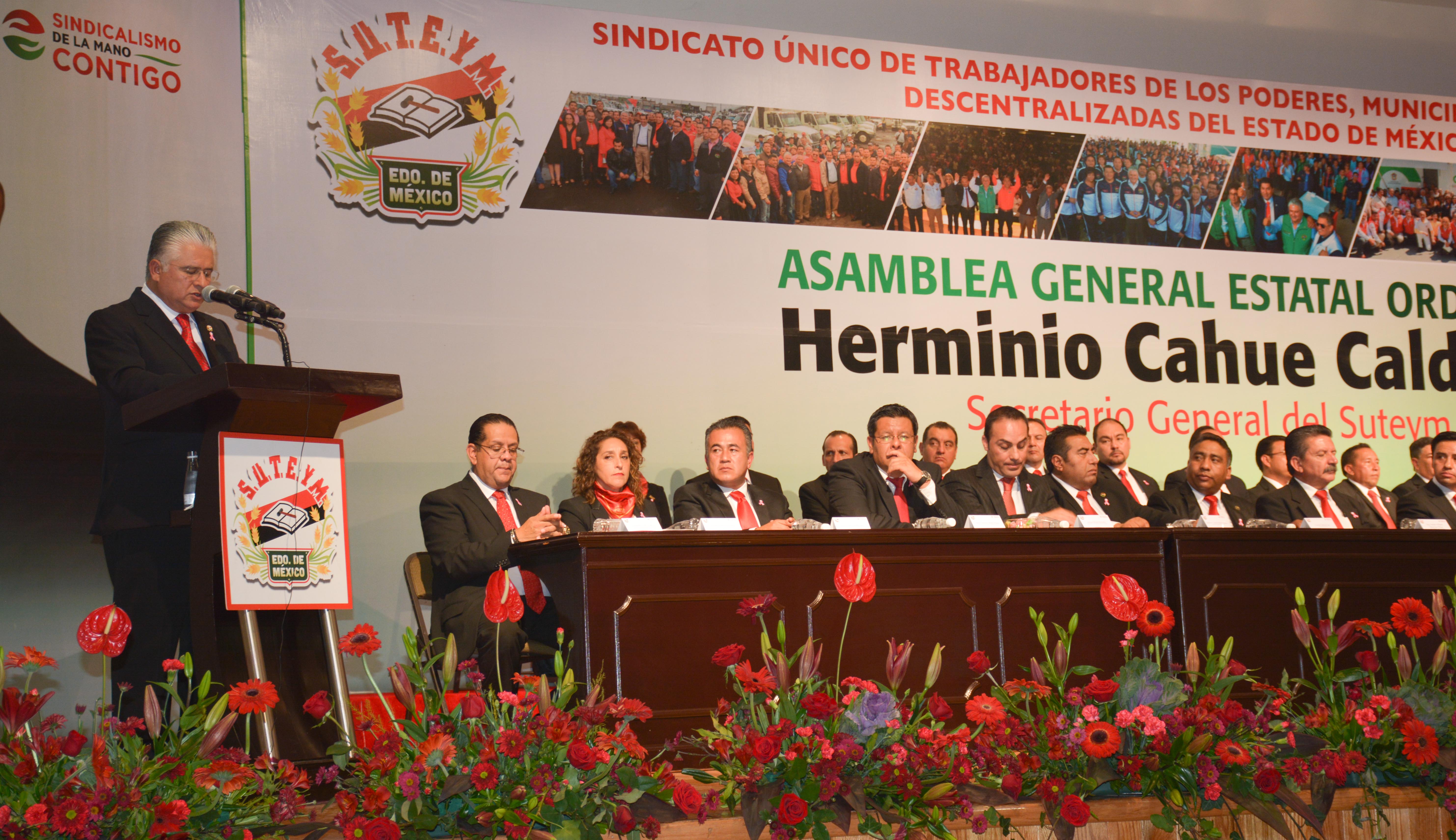 Herminio Cahue Calderón, Secretario General del Sindicato Único de Trabajadores de los Poderes, Municipios e Instituciones Descentralizadas del Estado de México (SUTEYM), rindió en Asamblea General Ordinaria, su 1er. Informe de Actividades ante la estructura sindical que representa a los más de 83 mil agremiados de la organización. “La unidad suteymista ha trascendido tiempo y circunstancias, en la continuidad de las acciones institucionales hemos encontrado la posibilidad de consolidarnos”, aseveró el líder estatal. Señaló que el SUTEYM, a 78 años de historia, es la estructura más grande de servidores públicos en el país, organización protagonista de las grandes transformaciones del sector público mexiquense, que ha acompañado a más de 15 gobernadores.