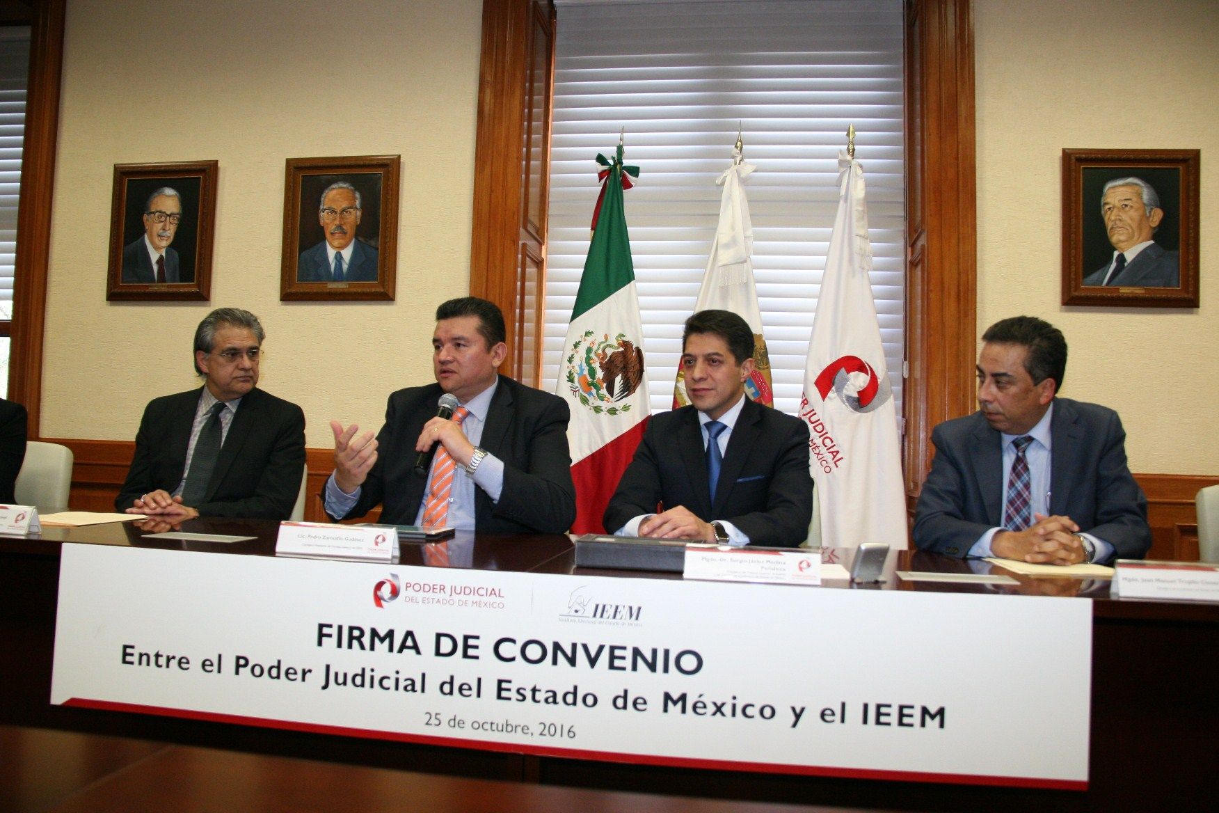 Previo a que se signara el documento, el Magistrado, Juan Manuel Trujillo Cisneros, dio la exposición de motivos, e hizo un esbozo sobre los trabajos que se realizaron para formalizar el Convenio, y que tiene que ver con una línea de acción del Poder Judicial, que es la de construir y fortalecer vínculos interinstitucionales, que tuvo como génesis en un primer contacto promovido por Liliana Martínez Garnica, Directora de Participación Ciudadana del IEEM.