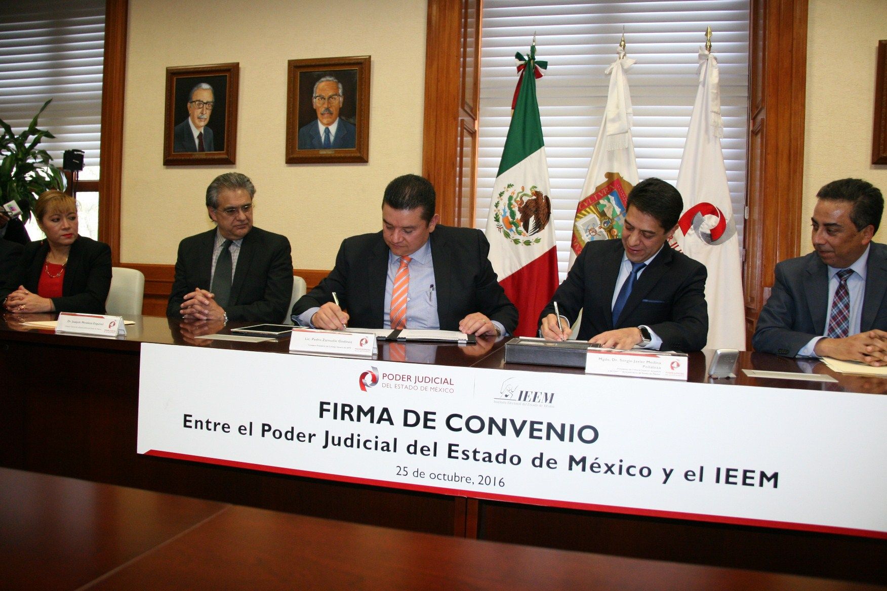 A efecto de potenciar la profesionalización así como enriquecer sus proyectos editoriales, el Instituto Electoral del Estado de México y el Poder Judicial del Estado de México firmaron un Convenio General de Colaboración, para impulsar acciones conjuntas, entre las que destacan el intercambio de publicaciones, material didáctico e información bibliográfica, realizar coediciones de publicaciones, y la promoción de actividades interinstitucionales.El convenio se firmó esta tarde en la sede del Poder Judicial del Estado de México por el Consejero Presidente del IEEM, Pedro Zamudio Godínez, y el Magistrado, Sergio Javier Medina Peñaloza, Presidente del Tribunal Superior de Justica.