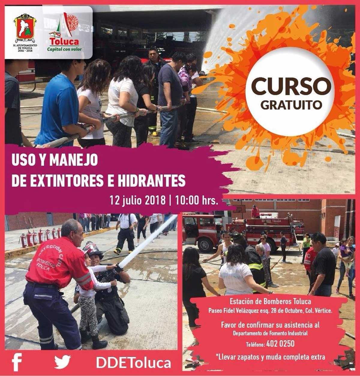 Como parte del “Programa de Capacitación Empresarial al Público en General, Micro, Pequeños y Medianos Empresarios de Toluca”, que impulsa la Dirección de Desarrollo Económico, organizó el quinto curso teórico-práctico en materia de protección civil, es decir tres de manejo y uso de extintores, otro sobre qué hacer en situaciones de siniestro, y uno más de seguridad e higiene, para que los empresarios, emprendedores y la población en general cuenten con los conocimientos básicos sobre el uso correcto de dichos instrumentos, como primera intervención en la extinción de un incendio.
