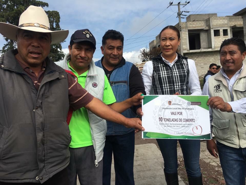 La diputada Leticia Mejía García (PRI) entregó material industrializado para iniciar obras de mejoramiento urbano como la pavimentación de accesos principales, la construcción de banquetas y el revestimiento de canales de riego en la comunidad de San Bartolo del Llano, municipio de Ixtlahuaca.Durante un recorrido por los barrios 5, 6 y 7 y la población de “El Resbalón”, la legisladora reconoció el apoyo del gobernador Alfredo del Mazo Maza, quien a solo unos días de iniciar su gestión ya está brindando resultados a quienes le otorgaron su confianza, atendiendo de manera pronta y oportuna las gestiones de los diputados.