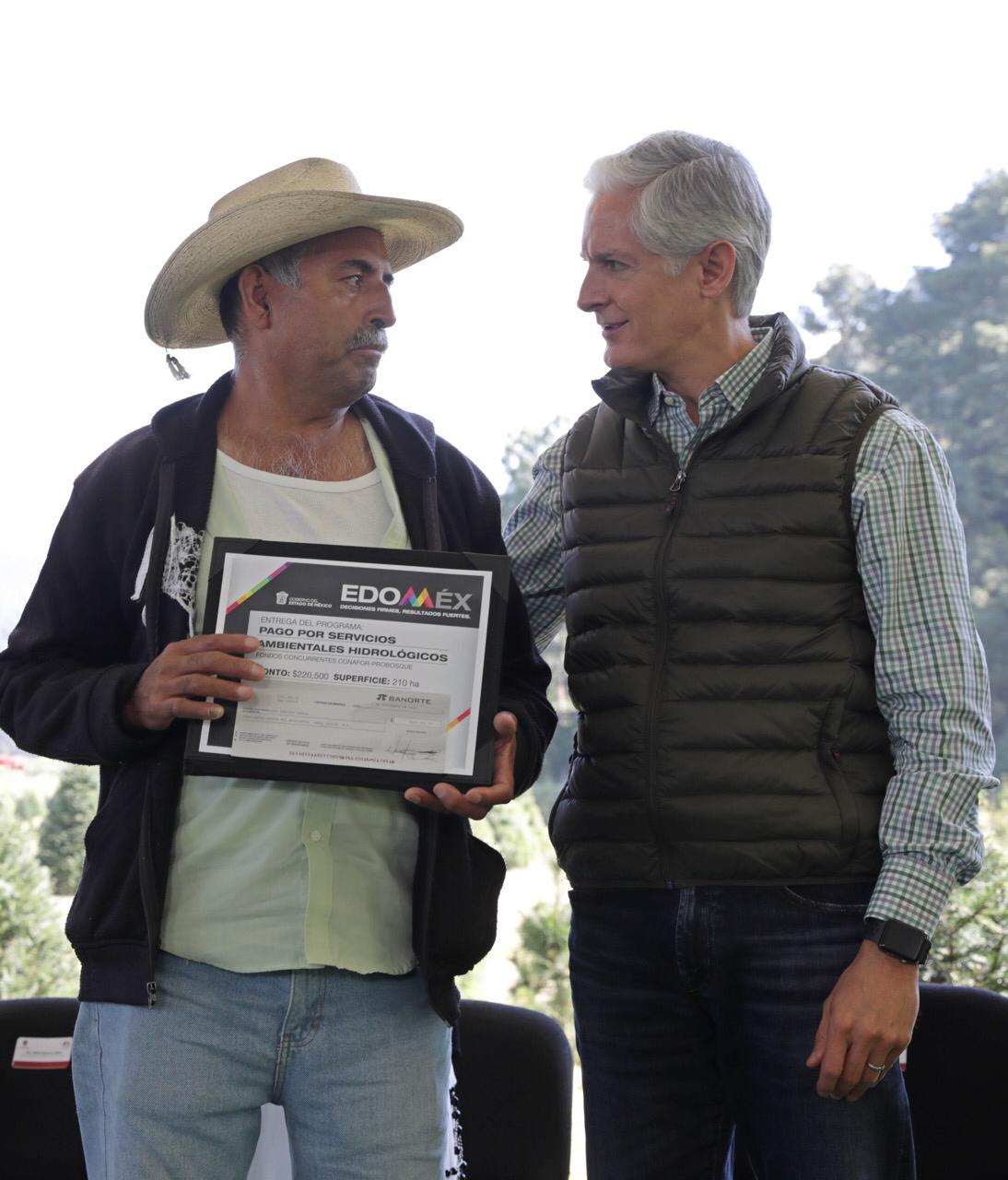 El Gobernador Del Mazo, junto con el Secretario de Medio Ambiente, Jorge Rescala Pérez y el Alcalde de Amecameca, Álvaro Avelar López, entregó apoyos a productores forestales, beneficiarios de los programas Pago por Servicios Ambientales Hidrológicos y Procarbono, y señaló que en su gestión se han entregado estímulos por un total de 142 millones de pesos.