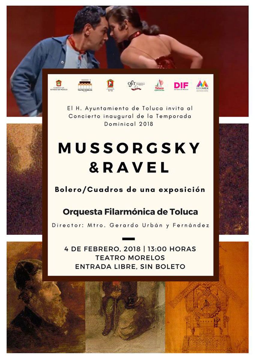 Toluca, Estado de México.- Con un espectacular concierto de Mussorgsky & Ravel dará inicio la Temporada Dominical 2018, con que la Orquesta Filarmónica de Toluca seguirá conquistando a propios y extraños con su talento y dinamismo, el próximo domingo 4 de febrero a las 13:00 horas, en el Teatro Morelos. La entrada será gratuita y sin boleto.
