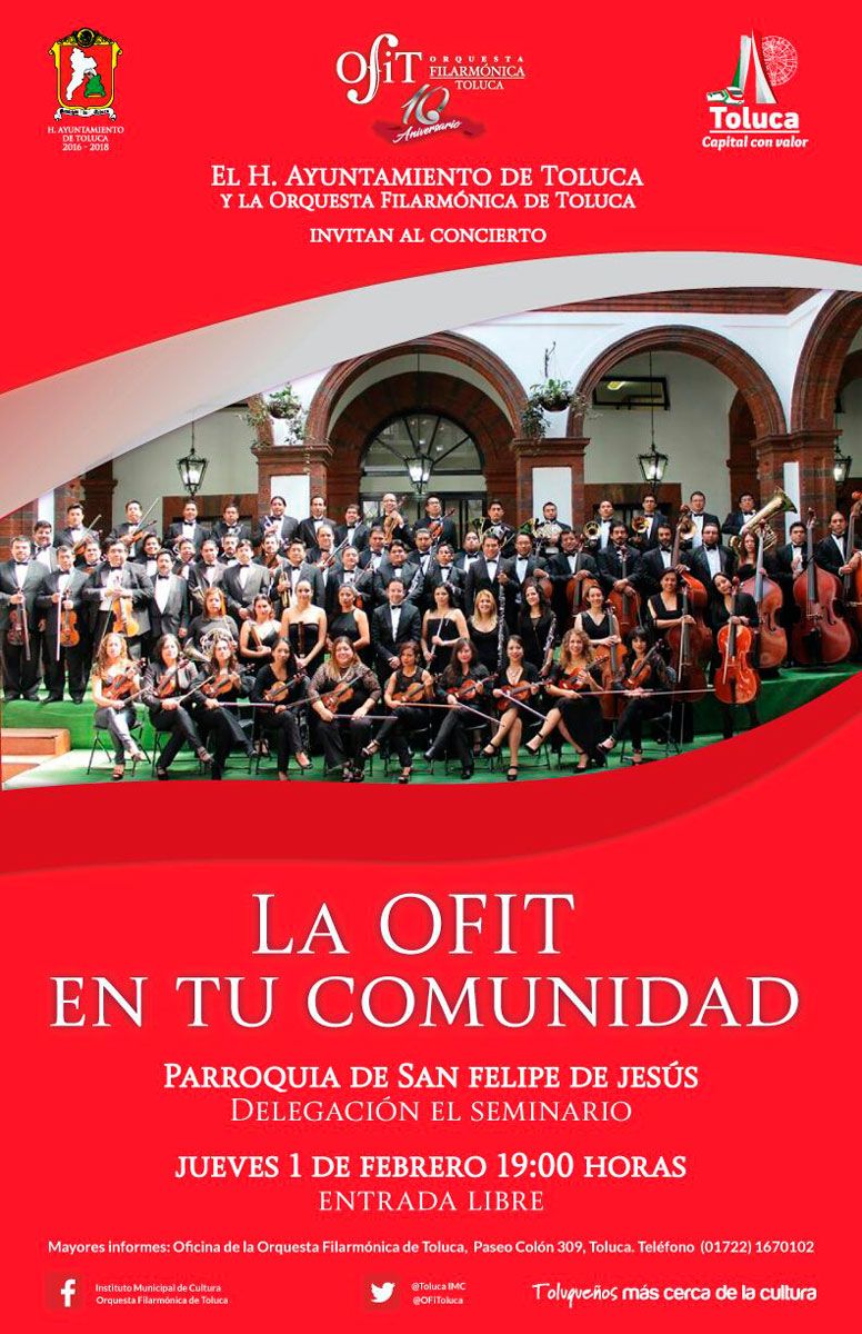 Para conocer el calendario de conciertos y las actividades de la OFiT, se invita a la población a seguir las redes sociales Facebook: Orquesta Filarmónica de Toluca y Twitter: @OFiToluca, o bien comunicarse al número telefónico 167 0102.
