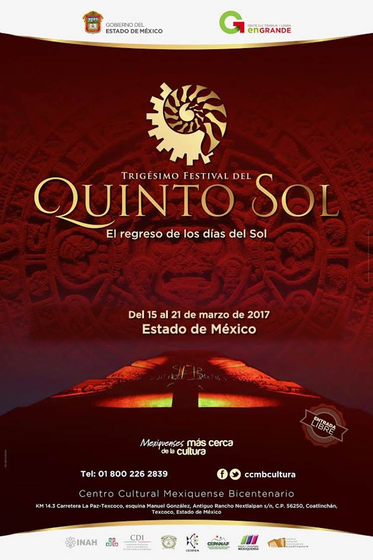 Con el objetivo de fortalecer el sentido de identidad como mexiquenses, el Gobierno del Estado de México a través de la Secretaría de Cultura, presentan en el Centro Cultural Mexiquense Bicentenario (CCMB) el Trigésimo Festival del Quinto Sol. El regreso de los días del Sol del 15 al 21 de marzo.Este festival cuenta con la colaboración del Instituto Nacional de Antropología e Historia (INAH), el Instituto Nacional de Lenguas Indígenas (INALI), la Comisión Nacional para el Desarrollo de los Pueblos Indígenas, la Universidad Autónoma del Estado de México (UAEM), entre otras instituciones.