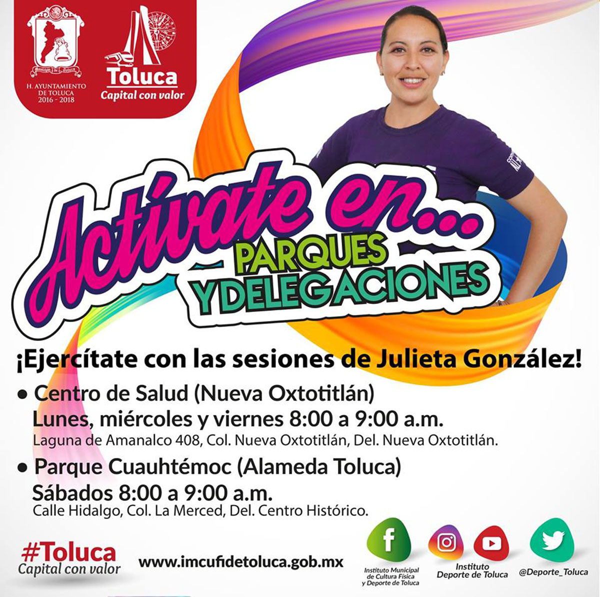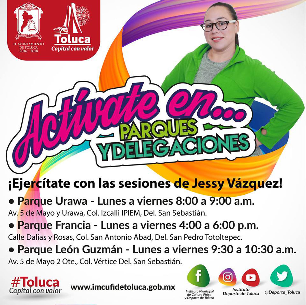 Otras opciones que el Instituto Municipal de Cultura Física y Deporte de Toluca (Imcufidet) pone a tu alcance son: lunes a viernes en Parque Urawa, de 8:00 a 9:00 horas; Parque Francia de 16:00 a 18:00 horas, y Parque León Guzmán de 9:30 a 10:30 horas, con la orientación de Jessy Vázquez.