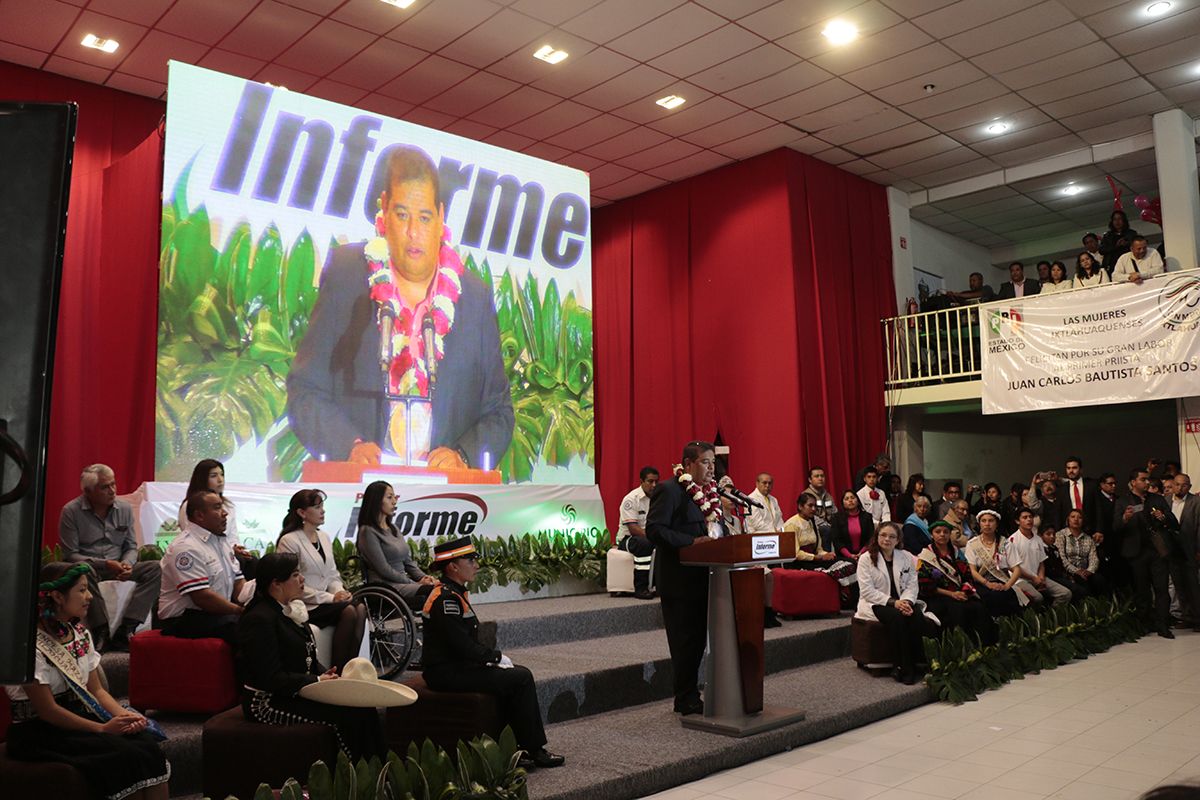 “En los tiempos actuales gobernar exige responsabilidad plena, visión de futuro y honestidad, honestidad para ejercer los recursos y honestidad para informar los resultados”, así lo señaló Juan Carlos Bautista Santos al dar su Primer Informe de Gobierno como presidente de Ixtlahuaca, agregando que los resultados son producto de un trabajo compartido, con las aportaciones de los tres niveles de gobierno y de los ciudadanos.Ante la presencia de Eduardo Gasca Pliego, presidente del gabinete regional en Ixtlahuaca y representante del gobernador Eruviel Ávila Villegas , el edil señaló que, conducir el destino de un pueblo en el marco de un estado democrático, es el encargo más honroso que pueda tener un ciudadano.