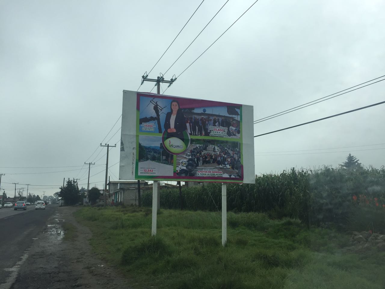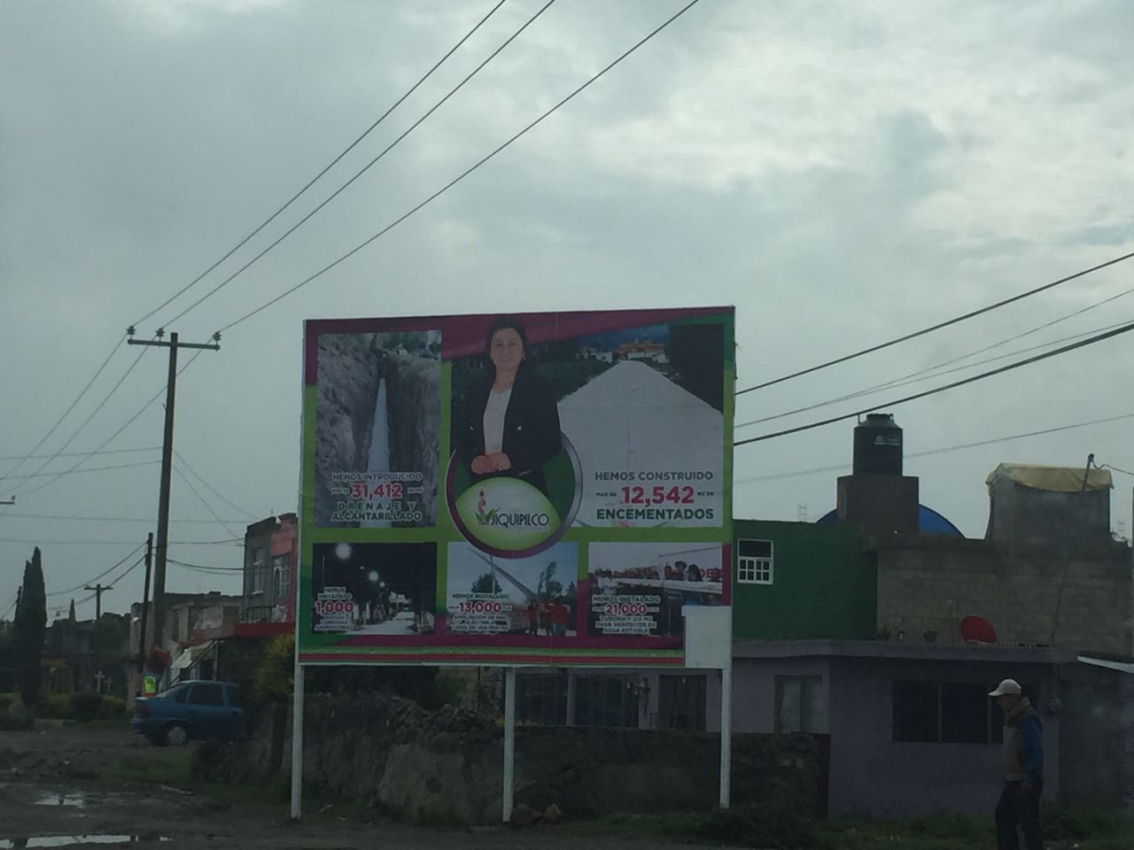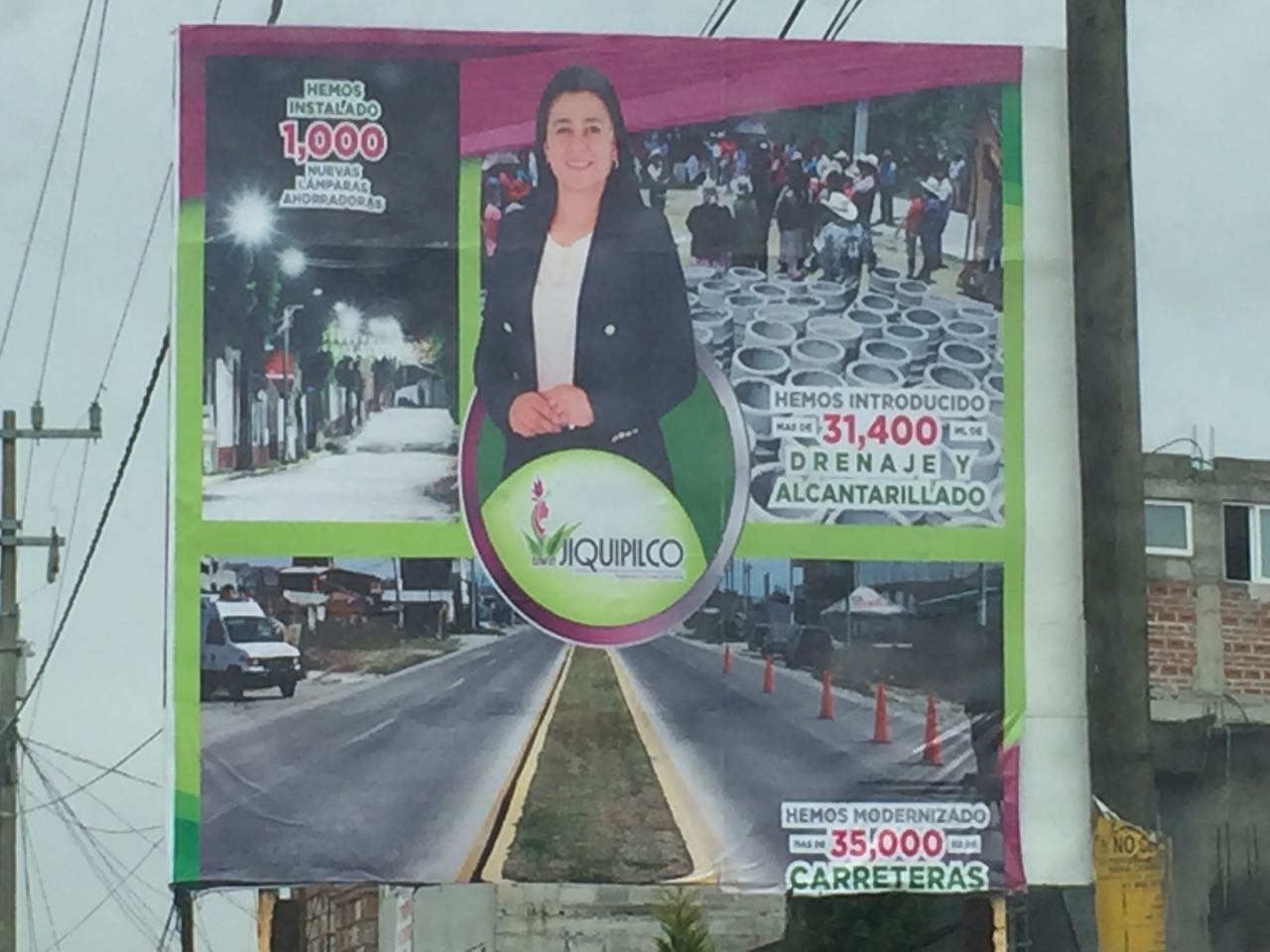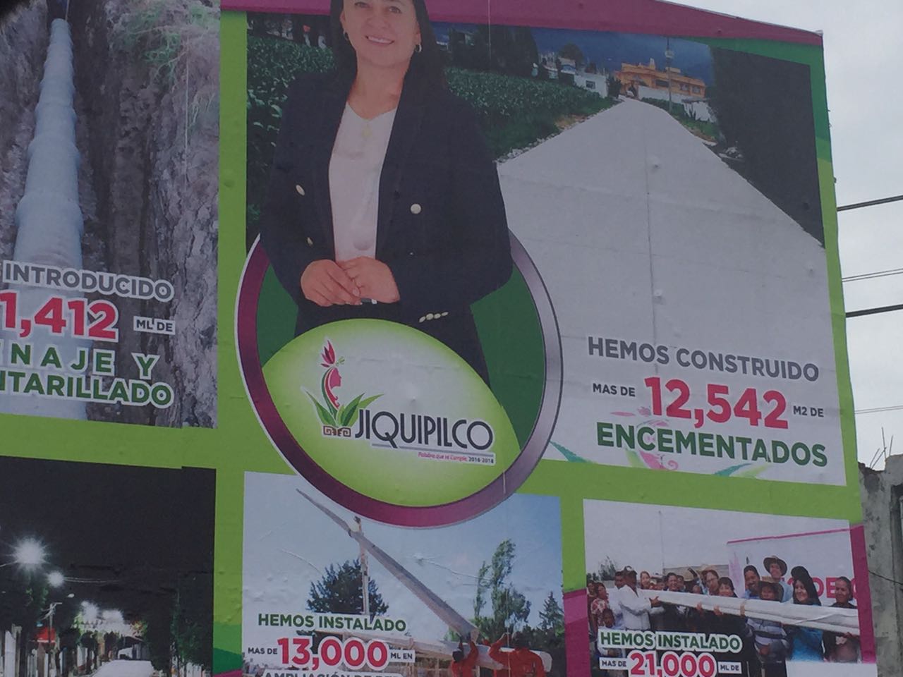 Pero esto no le importó a la presidenta municipal de Jiquipilco quien puso su imagen en espectaculares y vallas institucionales, asumiendo el crédito de las obras realizadas en la demarcación, mostrando un exagerado protagonismo toda vez que su foto aparece en todas ellas sin la menor justificación, dado que primeramente el Ayuntamiento no está conformado por una sola persona, sino por un cabildo, mismo que no aparece en la imagen gubernamental, lo que la convierte en una promoción personal.