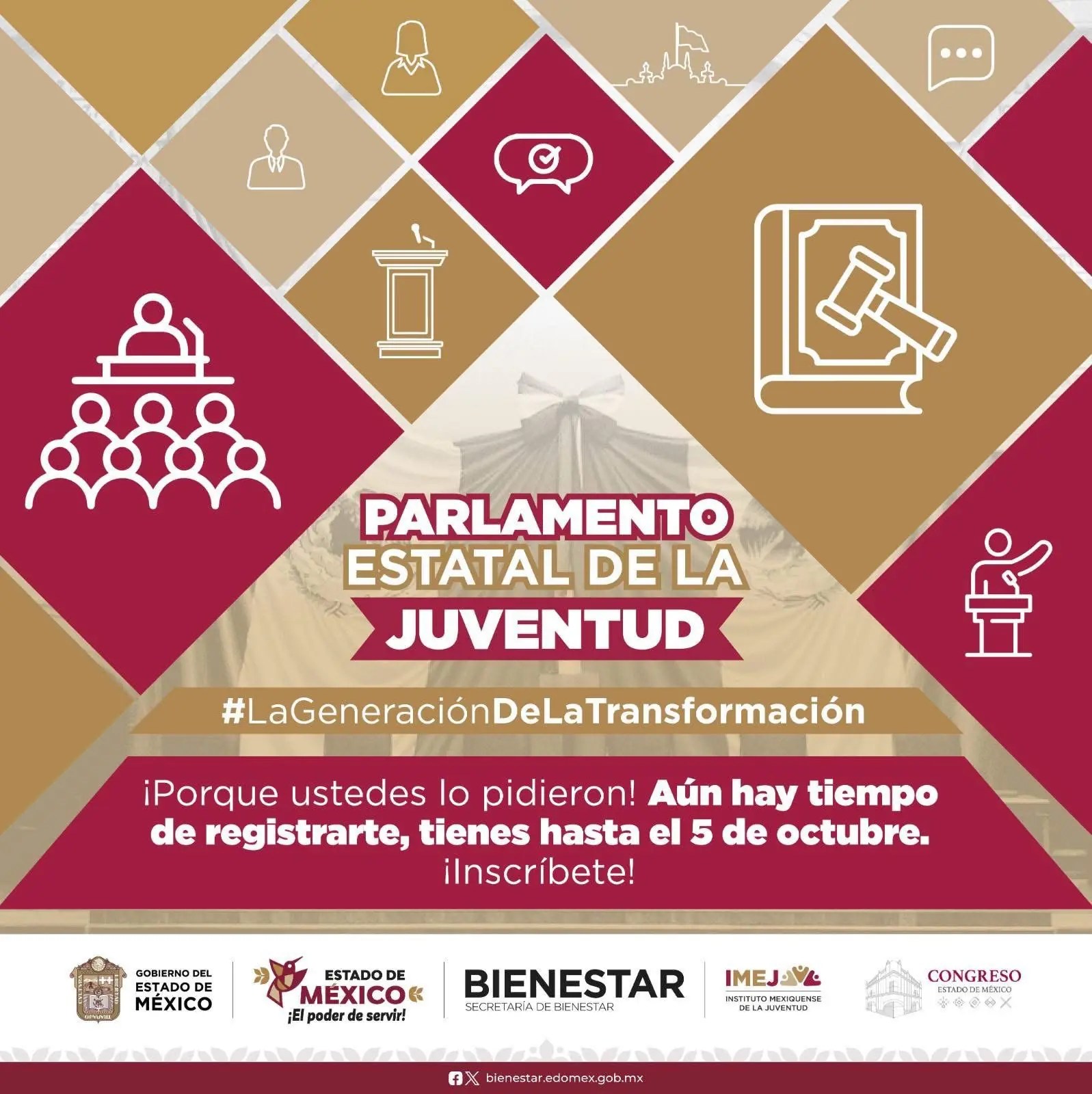 TOLUCA, Estado de México.- El Gobierno del Estado de México mantiene abierta la convocatoria del Parlamento Estatal Juvenil 2025, iniciativa dirigida a jóvenes de 18 a 29 años interesados en presentar, en la Legislatura local, propuestas para contribuir al desarrollo de sus municipios.