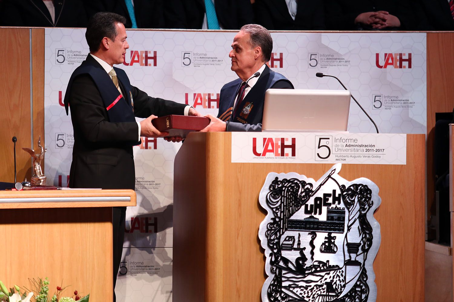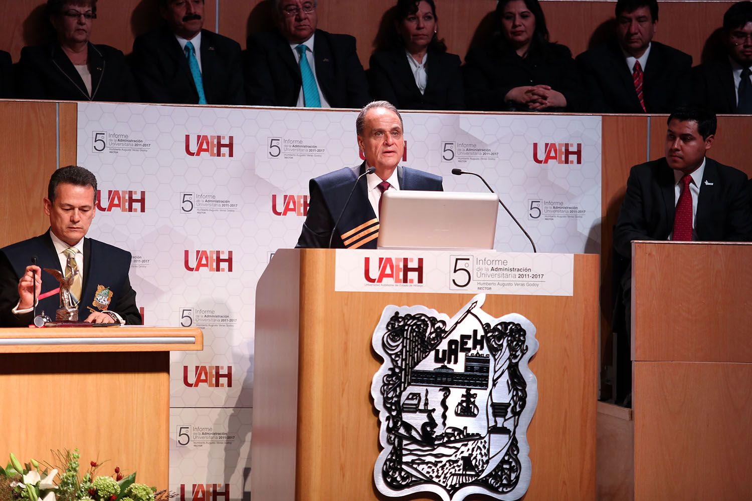 Los resultados entregados son una muestra clara de la suma colegiada de voluntades, compromiso y responsabilidad de todos los que integran la máxima casa de estudios en la entidad, continuemos trabajando por ella; la Universidad es mi orgullo, destacó Humberto Veras Godoy, rector de la Universidad Autónoma del Estado de Hidalgo (UAEH) en el marco del Quinto Informe de la Administración Universitaria, el cual rindió en sesión solemne ante el Honorable Consejo Universitario y en presencia del gobernador José Francisco Olvera Ruiz.