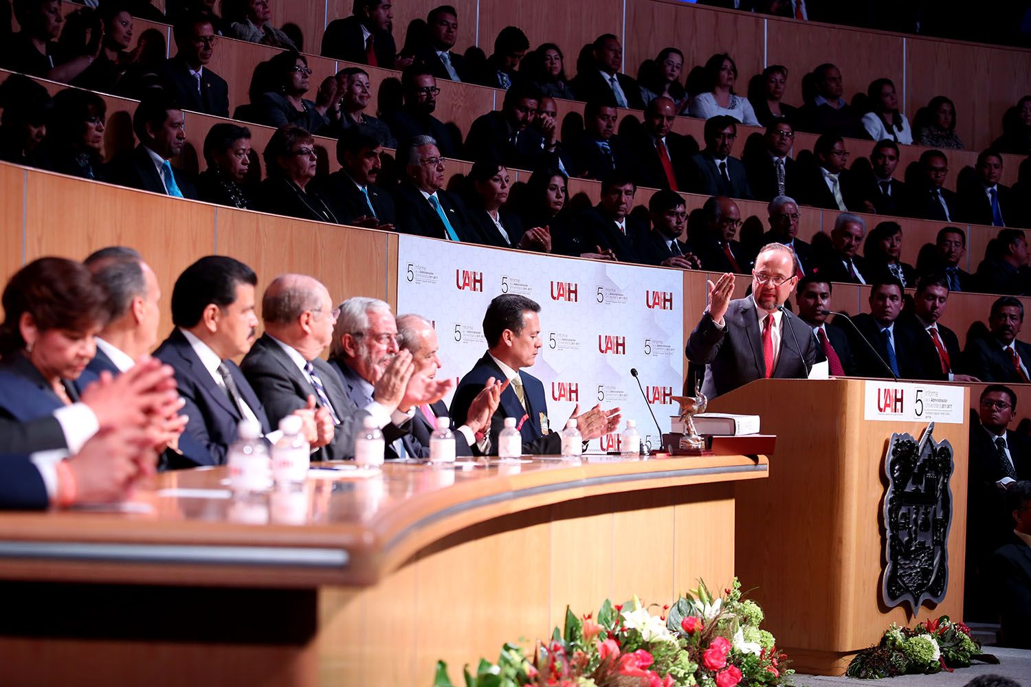 En tanto, Jaime Valls Esponda agradeció la posibilidad de hablar en nombre de su organismo y enfatizó que la ANUIES impulsa un proyecto con cinco ejes: ampliación de cobertura, orientar estándares internacionales, compromiso con la sociedad, legislación acorde a lo que se vive y la transparencia de los recursos. “La UAEH ha alcanzado grandes logros de manera sostenida y ascendente, logros que se reflejan en altos estándares de calidad”.