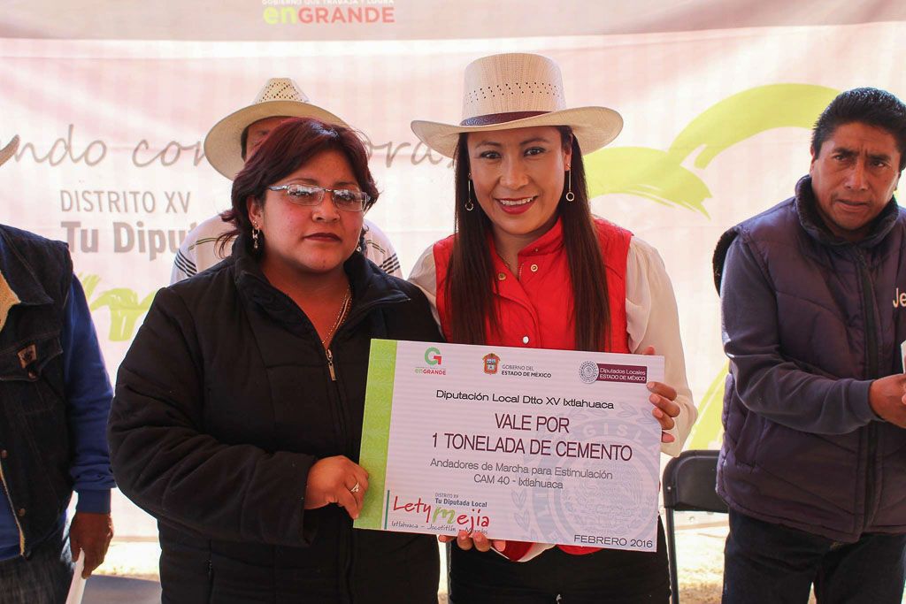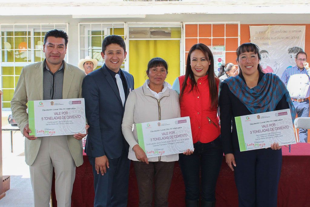 La diputada Leticia Mejía García (PRI) entregó material industrializado para el inicio y continuación de obras educativas, viales y de espacios públicos, en gira de trabajo por los municipios de Ixtlahuaca, Jocotitlán y Morelos, que integran el XV distrito electoral local.Además de informar los avances legislativos de septiembre de 2015 a la fecha, la también integrante de la Comisión de Asuntos Indígenas de la 59 Legislatura mexiquense dijo que la entrega de estos recursos es posible gracias al apoyo del gobernador Eruviel Ávila Villegas, ante quien realizó la gestión correspondiente.