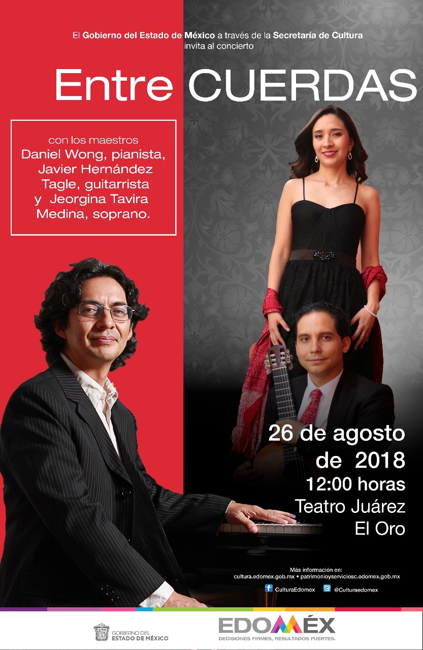 Toluca, Estado de México.- El centenario Teatro Juárez, del Pueblo Mágico de El Oro, será la sede donde por primera vez se presenten de manera conjunta la soprano Jeorgina Tavira, el pianista Daniel Wong y el guitarrista Javier Hernández Tagle, quienes bajo el auspicio de la Secretaría de Cultura mexiquense unirán su talento en el recital denominado “Entre cuerdas”, el domingo 26 de agosto a las 12:00 horas.