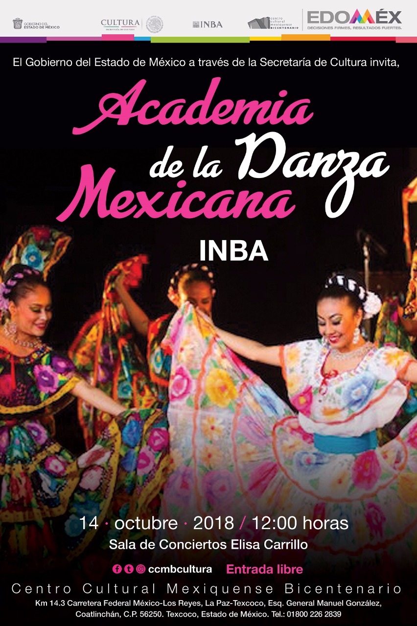 Texcoco, Estado de México, 11 de octubre de 2018. Para fomentar el sentido de identidad entre las y los mexiquenses a través de las artes, el Centro Cultural Mexiquense Bicentenario (CCMB) presenta a la Academia de la Danza Mexicana del Instituto Nacional de Bellas Artes (INBA), en un espectáculo de danza popular mexicana el 14 de octubre a las 12:00 horas.